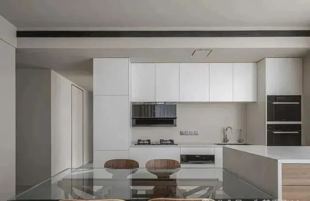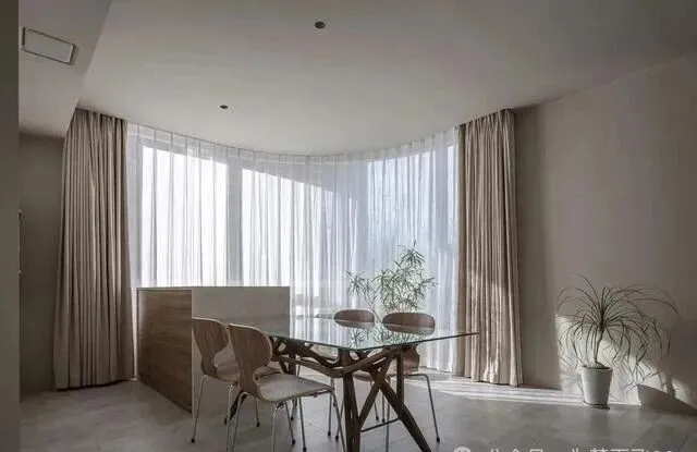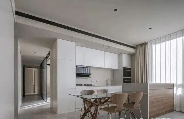 再说厨房和餐厅,这地儿要讲究一个灵活切换,那桌子跟外面饭店的可不一样,是能推能挪的,夫妻两个平时吃饭桌子靠边站,腾出来就是操作台,下厨切菜不用窝着,来了客人桌子往中间一搁,一圈人能坐满,落地大窗干脆打开,光撒进屋,连风景都能捎带着看,谁说厨房一定油烟味冲天,这家把所有机器全埋进柜门里,干净利落,地上都能照出人影,现在外卖满天飞,家里还肯下功夫整出这么亮堂的厨房,心里头有数。