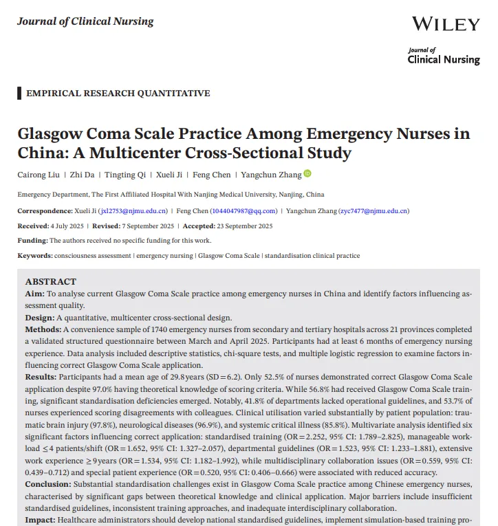 既往研究(如国外调查)也发现GCS应用存在变异,但本研究的理论-实践差距尤为突出(97% vs 52.5%),可能与中国急诊护士培训以理论为主、临床实操指导不足有关。此外,本研究首次量化了多学科协作问题对GCS准确性的影响,拓展了影响因素的范围。