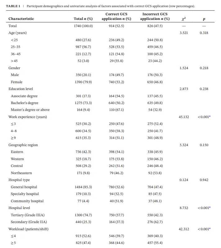 然而,GCS的正确应用依赖于护士的标准化操作和对评分细则的准确理解。实际操作中,由于患者个体差异(如气管插管、面部水肿、语言障碍)、评估者经验差异以及科室缺乏统一指导等因素,常导致评分不一致或错误,影响临床决策。在中国,急诊护士面临工作负荷大、患者周转快、培训资源有限等挑战,GCS应用的规范性和准确性可能存在问题。然而,目前缺乏大规模、多中心的调查数据来量化这一现状并识别影响因素。因此,开展本研究具有重要的临床意义。
