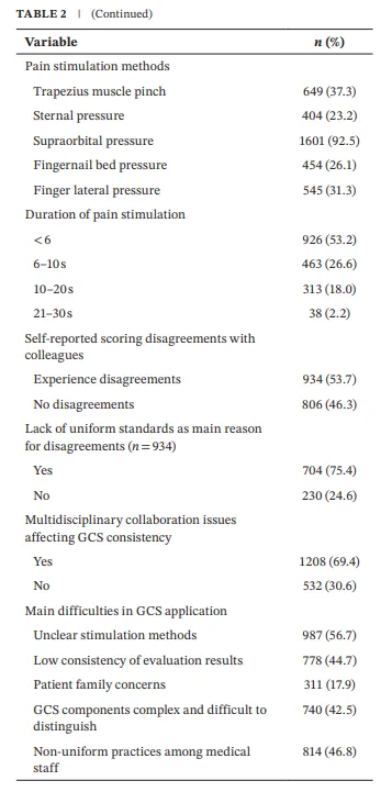 GCS临床应用:是否接受过培训、科室是否有操作指南、与同事是否存在评分分歧、是否曾在特殊患者(如气管插管、面部创伤)中应用GCS、GCS使用频率等。