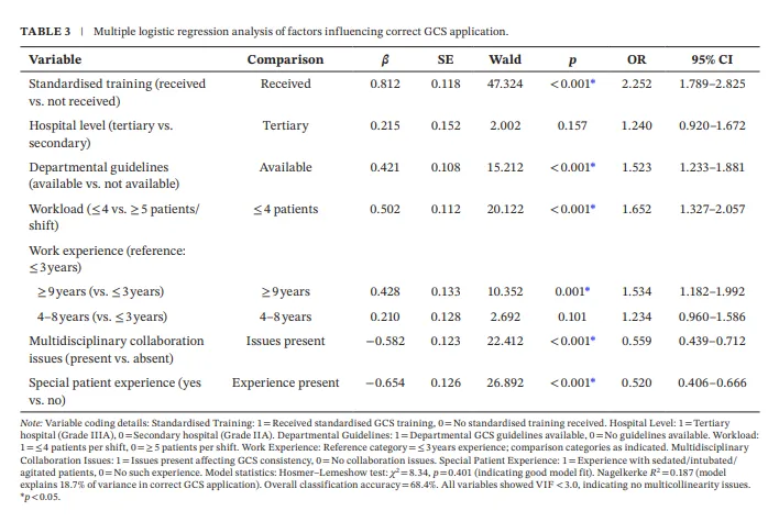 多元Logistic回归:以“能否正确应用GCS”为因变量(二分类),以单因素分析中有意义的变量为自变量,采用逐步回归法筛选独立影响因素。计算比值比(OR)及95%置信区间(CI)。