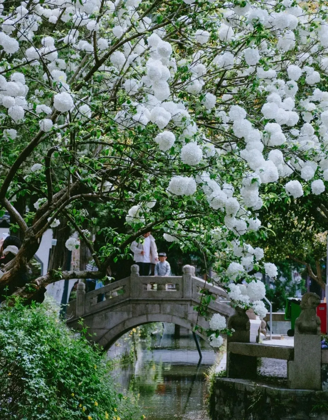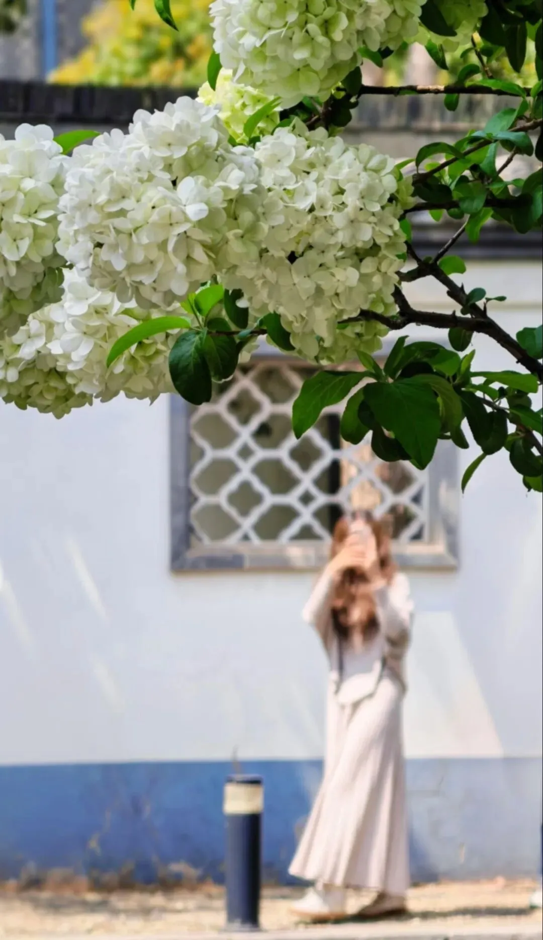 站在湖水对岸,以漫天绣球花为前景,对岸的水榭亭台做背景,雪白花团映着粼粼碧波,古建剪影衬着繁花似锦。