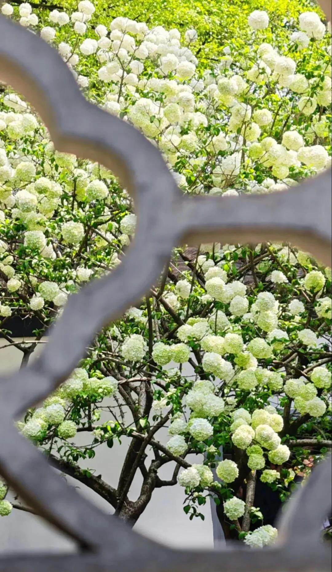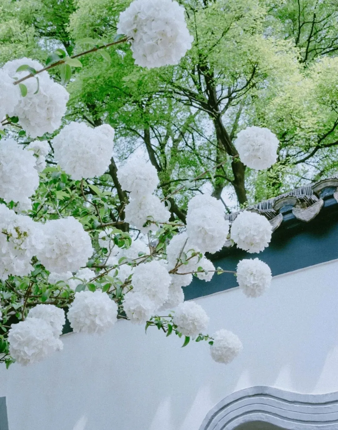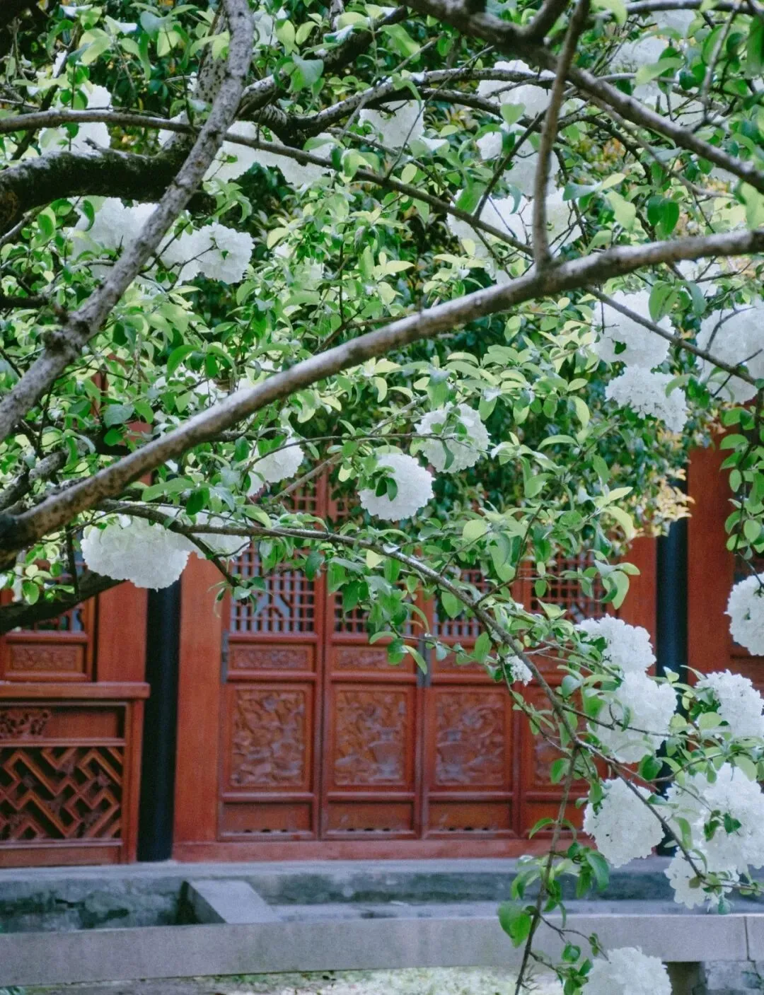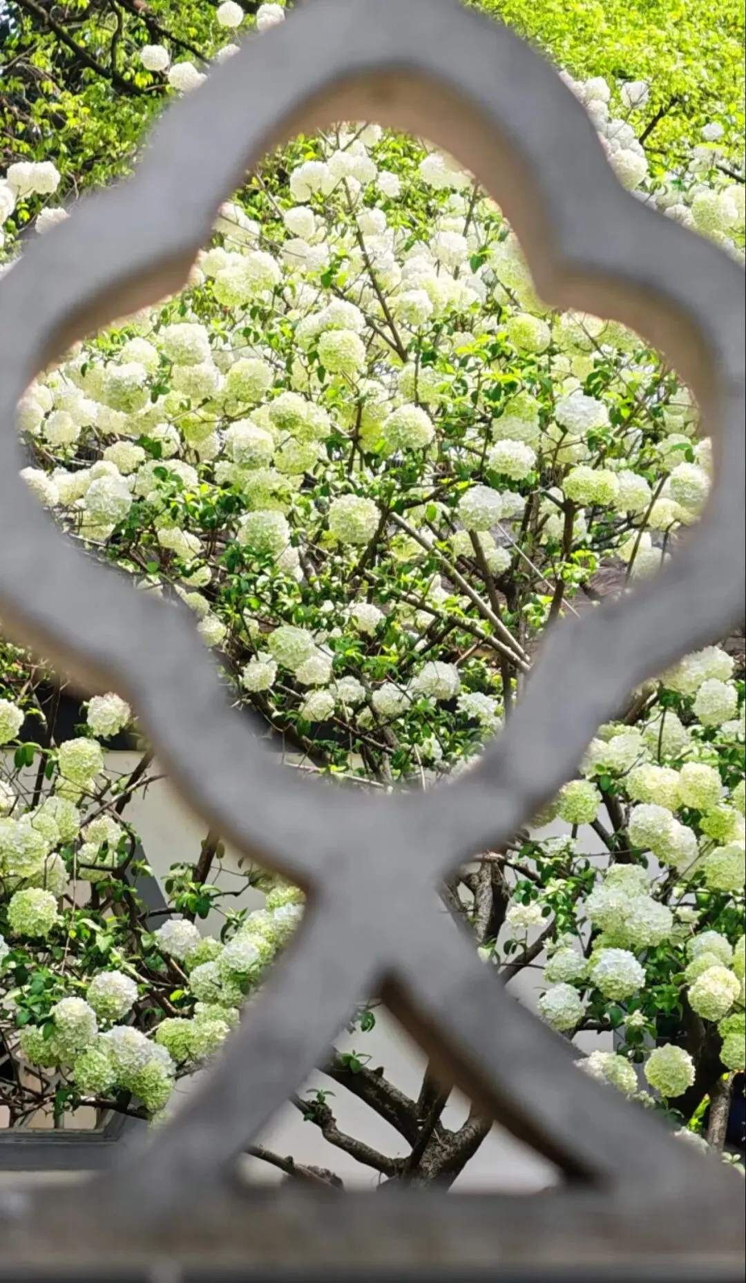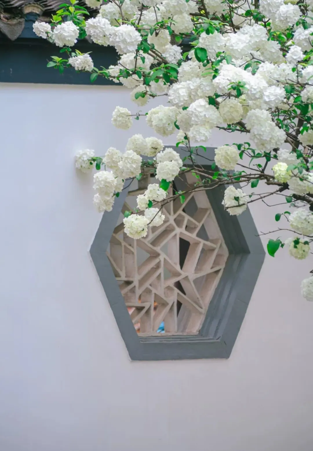 粉墙黛瓦,雕花漏窗,半遮半掩间,绣球花枝悄然探出,完美诠释中式园林的留白意境。