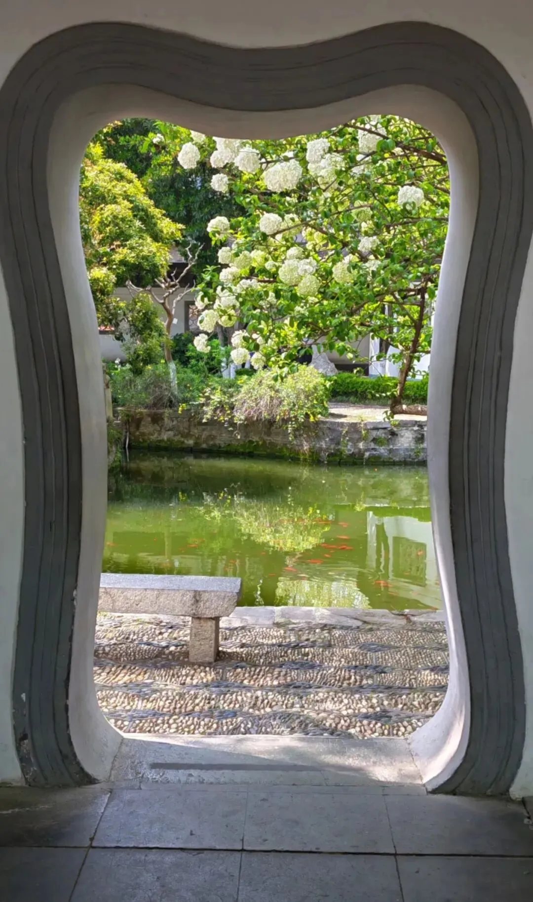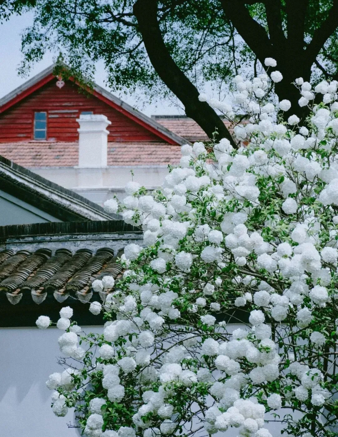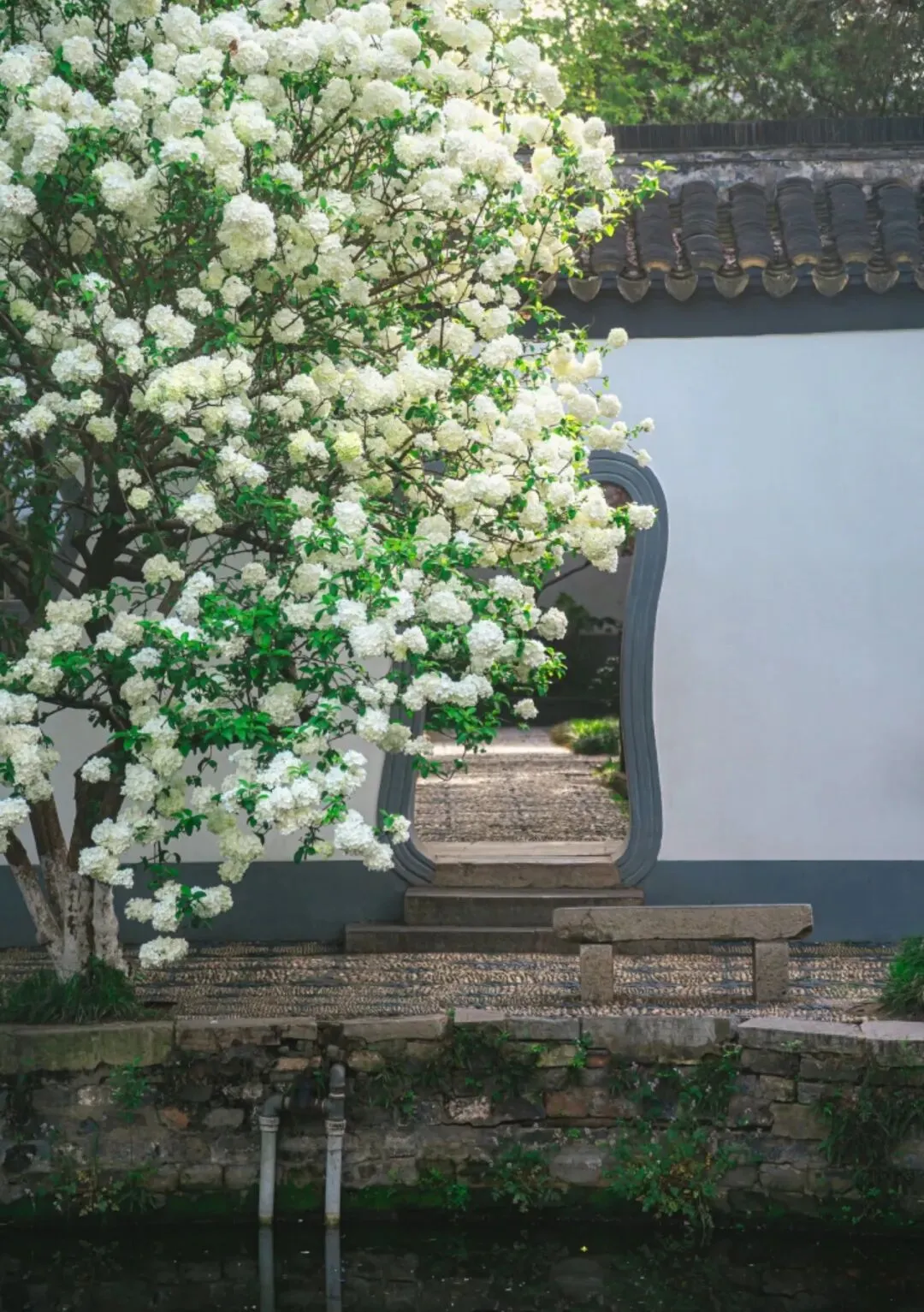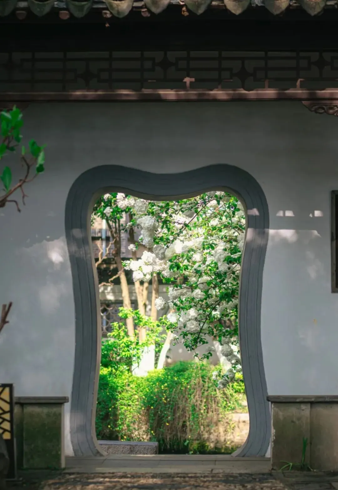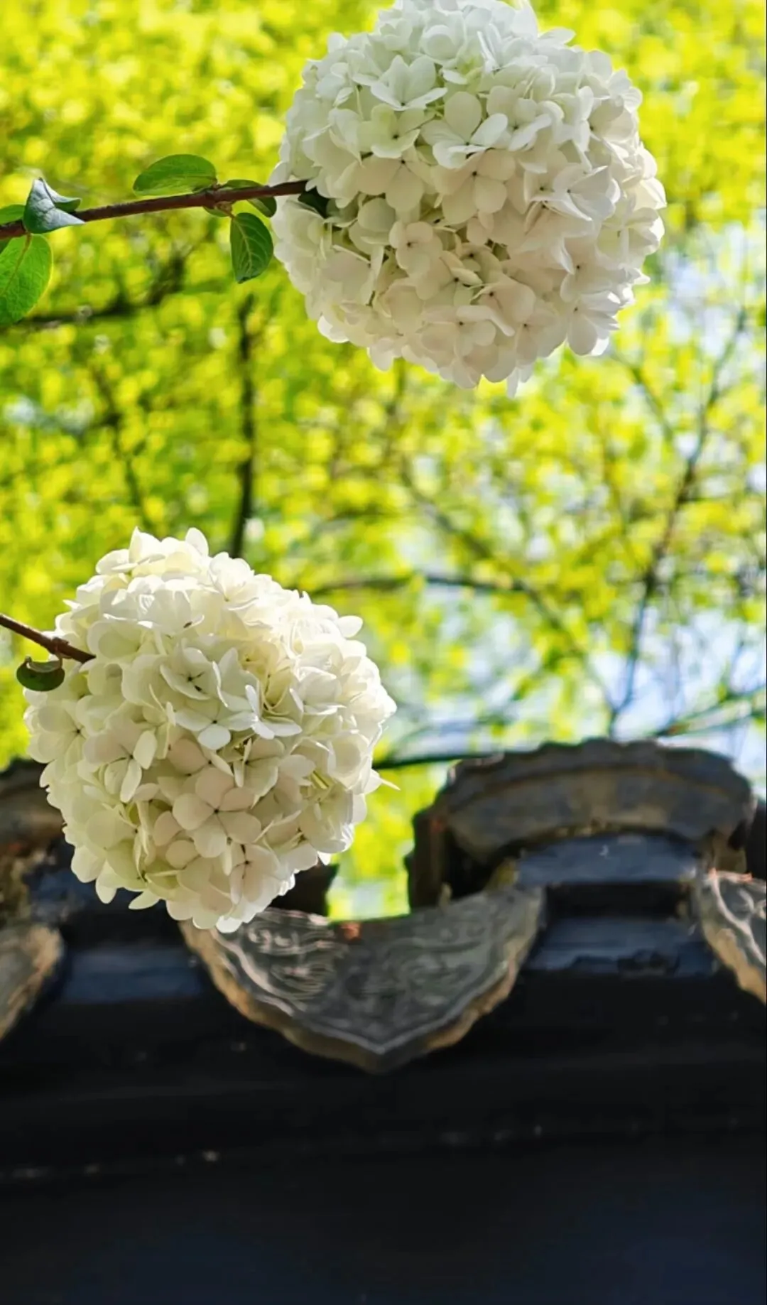 粉墙黛瓦,雕花漏窗,半遮半掩间,绣球花枝悄然探出,完美诠释中式园林的留白意境。