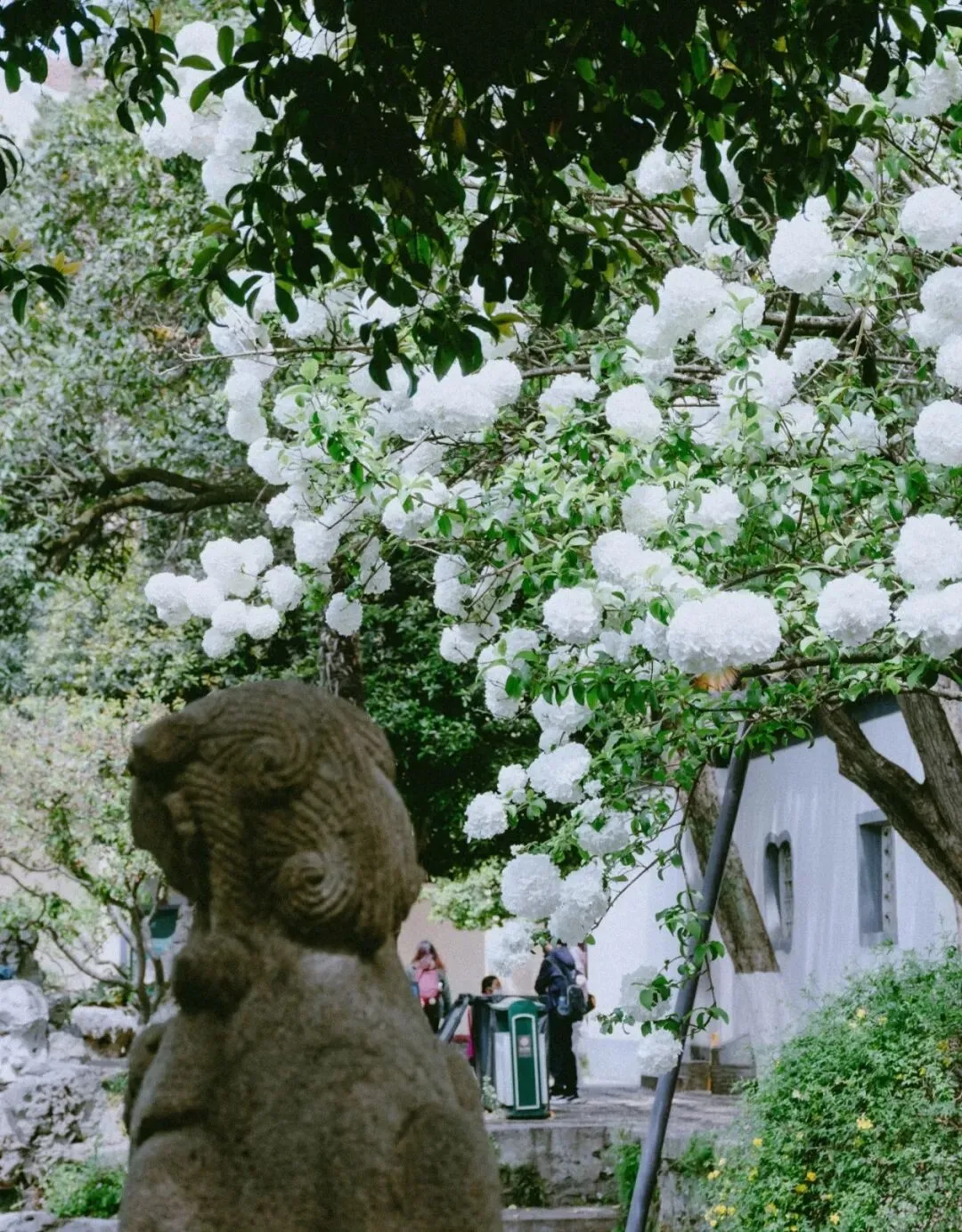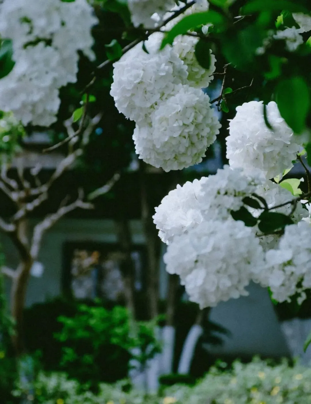 雨后的绣球更是绝美,水珠滚落花间,清新脱俗,偶尔还能遇见慵懒的小猫,在花树下安然打盹,温柔又治愈,瞬间戳中内心柔软。