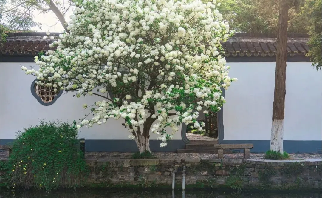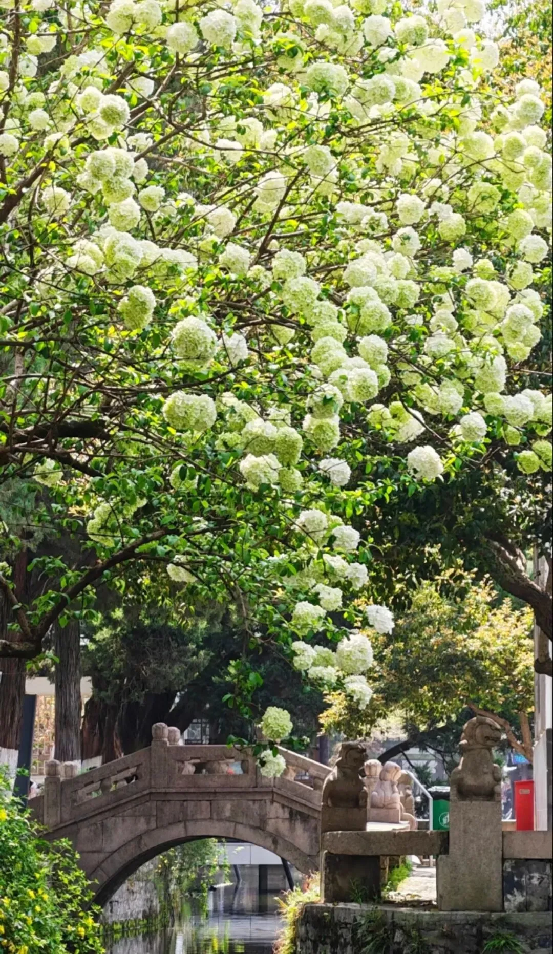 风穿过百年古建,拂过枝头繁花,花影轻摇,水波微漾,仿佛百年前的春风,也为这抹雪白停留,温柔了岁月,惊艳了时光。