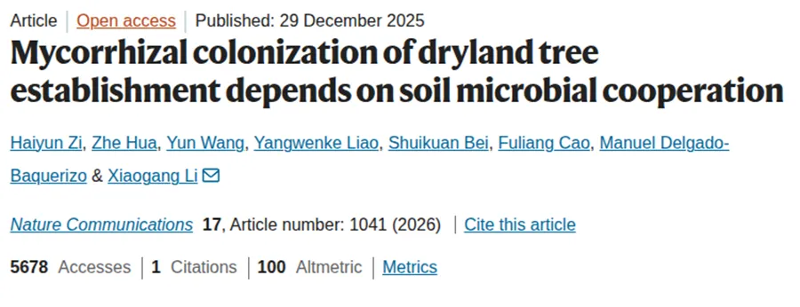 今天我们来学习南京林业大学国家重点树木遗传与育种实验室李孝刚教授团队,于2025 年 12 月发表在 Naturecommunications上的题为 “Mycorrhizal colonization of dryland tree establishment depends on soil microbial cooperation” 的文章。