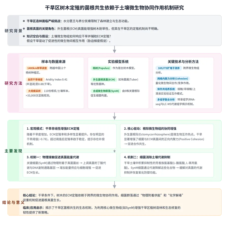 长期以来极端干旱环境如何影响植物与菌根真菌共生体系的建立一直是生态学领域的认知盲区。传统观点多认为水分与养分匮乏会直接抑制菌根共生但本研究打破了这一固有假设提出了一种基于胁迫梯度假说的新范式。研究不仅发现干旱胁迫实际上促进了外生菌根的定殖更深刻揭示了外生菌根际细菌群落在其中的核心驱动作用。在实验设计上该研究构建了极具说服力的逻辑闭环从跨越1400公里的大尺度野外表型测定与微生物组测序到基于共现网络的关键菌株筛选再到合成微生物群落的体内外回补实验最终结合转录组与代谢组学精准锁定了细菌通过物理附着上调真菌丁酸代谢以及降解土壤抑制性芳香族氨基酸的双重促生机制。这种从宏观生态模式到微观分子机制的跨尺度研究策略为复杂微生物互作的因果推断提供了优秀的参考模板同时也为利用靶向微生物组工程提升旱区生态恢复与林业造林成功率提供了坚实的理论支撑与切实可行的应用策略。