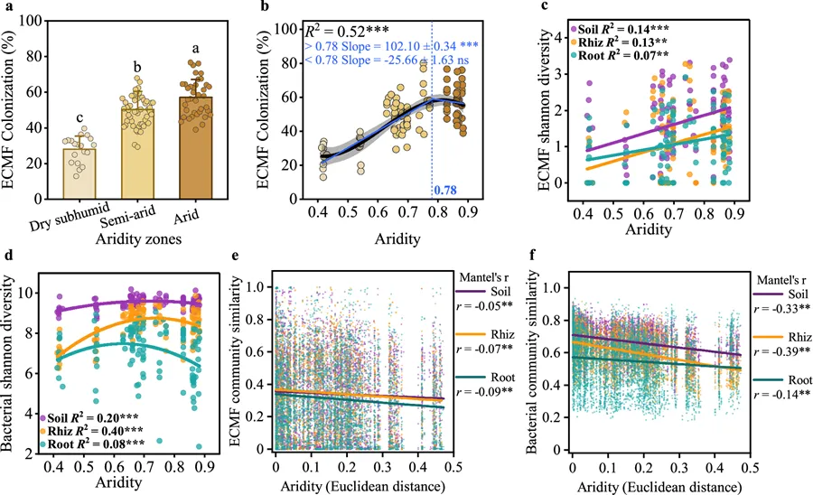 研究团队通过跨越1400公里的区域尺度野外调查和三万多次显微镜检系统评估了干旱梯度下杨树外生菌根的定殖情况。结果出人意料地表明干旱显著增加了外生菌根的定殖率干旱区的定殖率是半干旱区和亚湿润干旱区的两倍以上。这种定殖率的增加在干旱指数达到0.78的阈值之前呈现显著的线性增长趋势。此外干旱还显著提升了外生菌根际和根尖上外生菌根真菌的阿尔法多样性。这些宏观生态学证据强有力地支持了在极端干旱环境中树木的建立更加依赖于菌根真菌共生的假说凸显了外生菌根在树木适应水分胁迫中的关键功能特征。