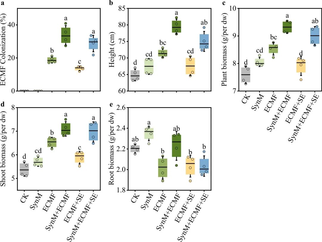 3. 成功筛选并构建了由九株核心细菌组成的合成微生物群落能够显著提升外生菌根真菌的定殖率并促进宿主植物生长。