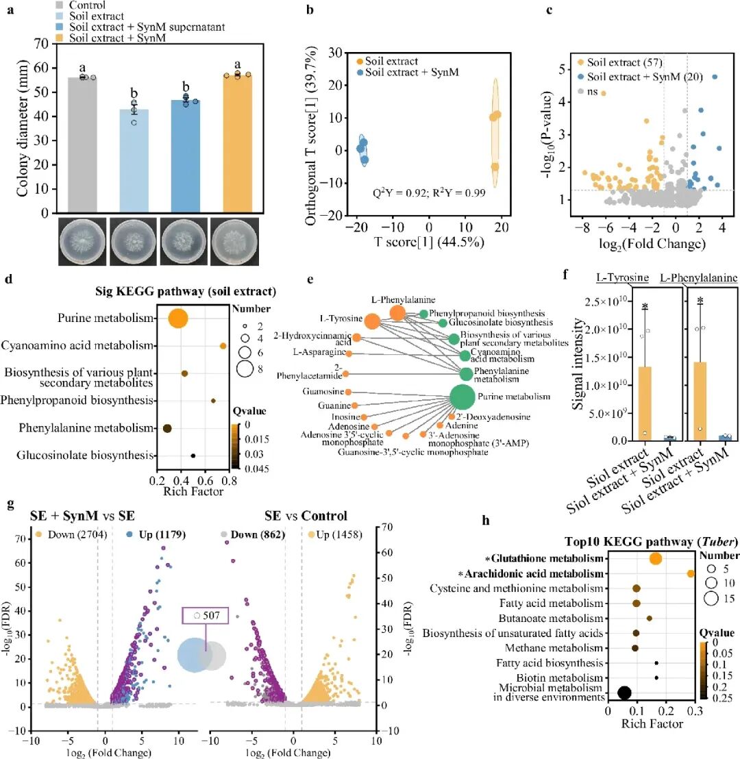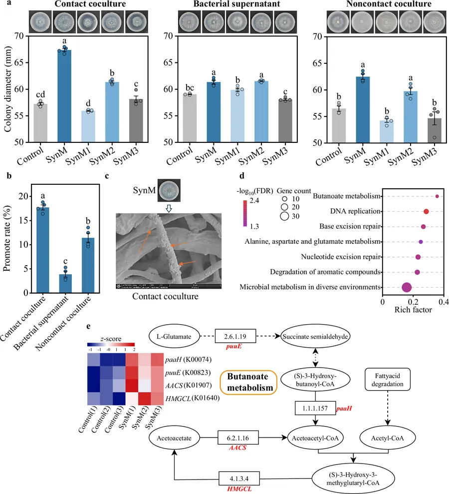 4. 多组学分析阐明了合成菌群通过物理附着上调真菌丁酸代谢以及降解土壤抑制性代谢物来解除环境压力的双重促生机制。