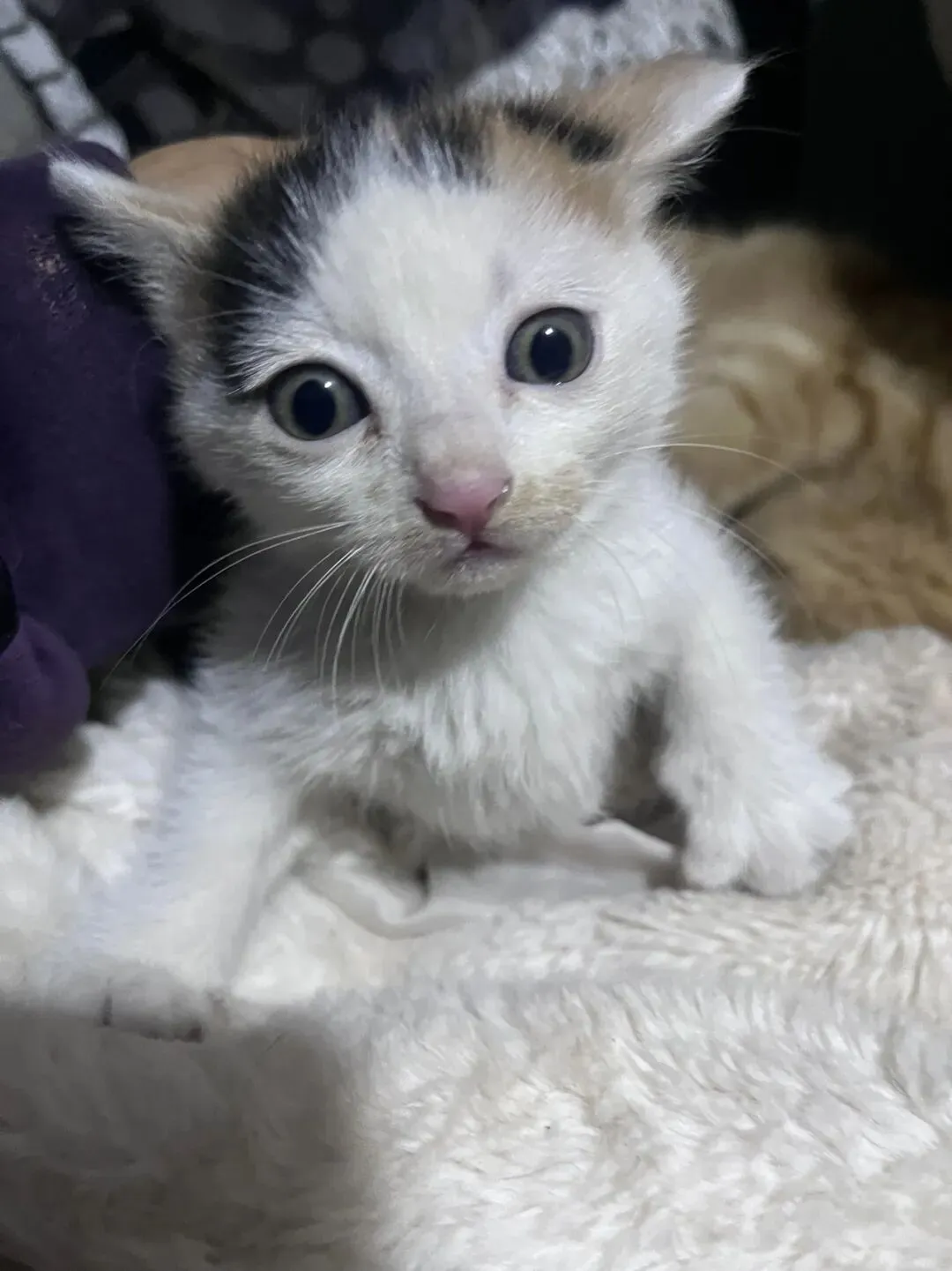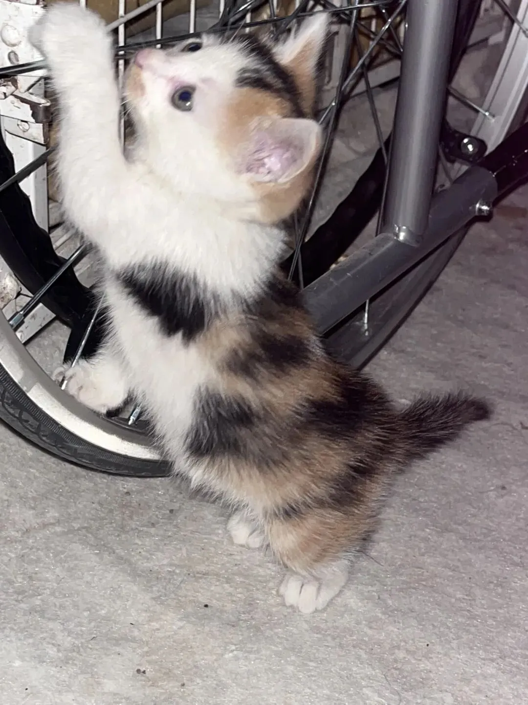 第三只是三花妹妹,白花花的脸蛋配上橘黑相间的花纹,颜值超高,像个精致的小天使。它会扒着笼子好奇张望,也会躲在角落偷偷观察你,熟悉之后就会变得黏人又温顺,是个慢热但超暖心的小家伙。