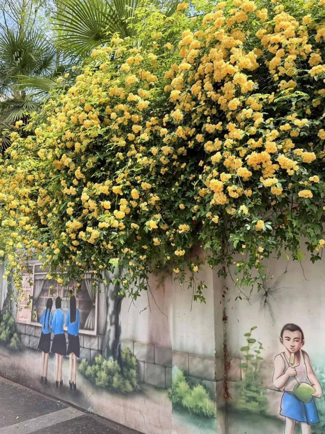 📜总体说碑亭巷的黄木香虽然没有古林公园的看起来那么壮观,不过它胜在绵延十几米长,围墙上还有一排手绘的民国风情背景墙可搭配拍照,适合人像。远远看去是一片金黄,当你拉近镜头会发现是重瓣黄木香中混入了些许重瓣白木香,像瀑布一样~