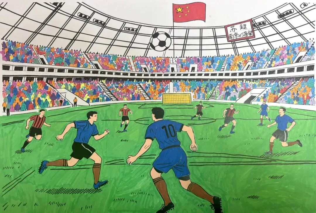 这幅“太空级”画作的诞生,藏着一枚铁杆“苏超粉”的热爱与灵感。时间拉回去年6月14日,“苏超”第四轮淮安主场对战南京的赛场,绿茵场上球员们奋力奔跑、团结协作的拼搏姿态,看台上球迷挥舞旗帜、热情欢呼的沸腾氛围,深深打动了小沐妍。作为平日里就爱涂涂画画的“小画手”,她当即决定用画笔“复刻”下这难忘的瞬间。