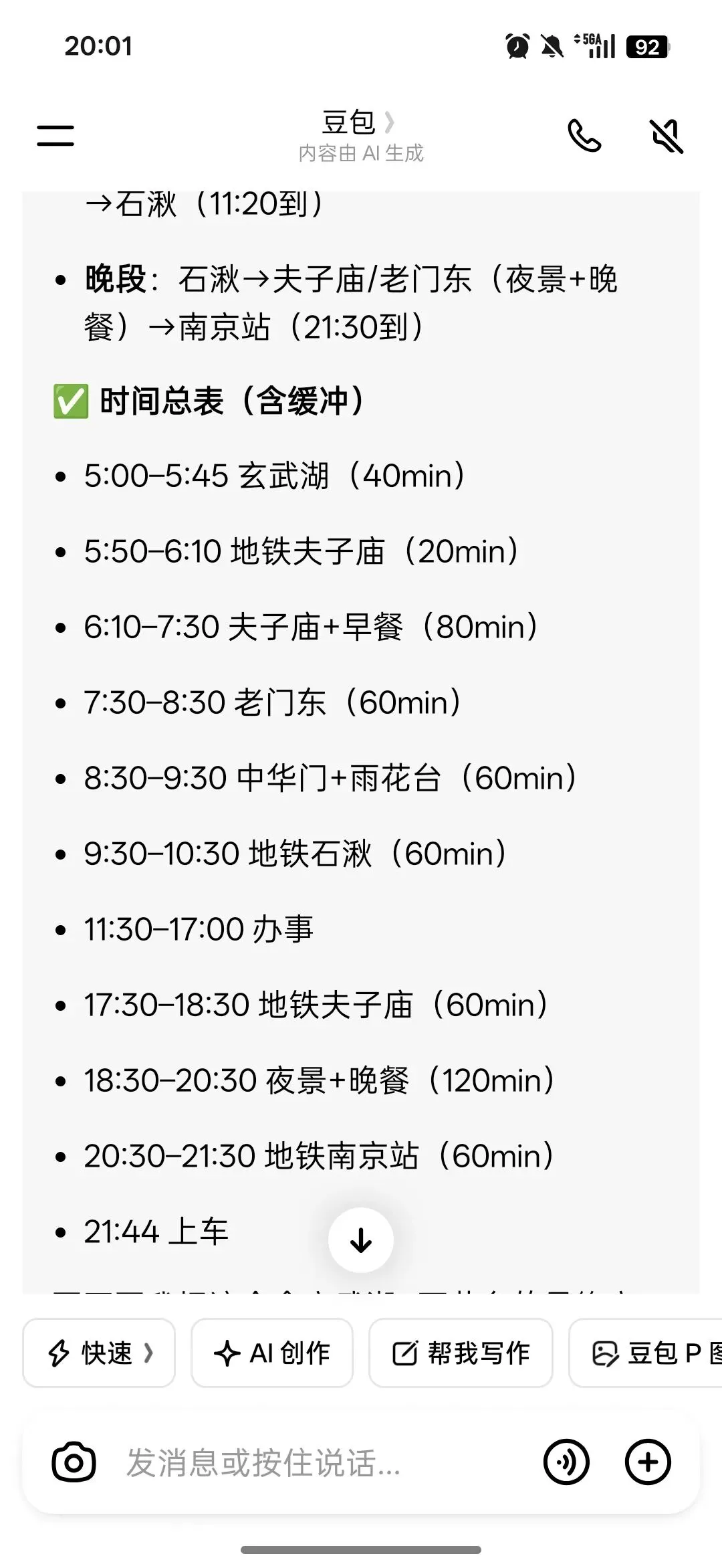 导演安排观众们11点30分左右在石湫地铁站集合,那里会有一辆大巴车接送我们去影视录制基地,江苏台的大部分节目都是在石湫影视基地录制的。我们动卧到的时间是早上5点左右,天还没有亮。好不容易来一趟南京,我和我爸商量着转转南京当地有名的景点,等快到中午,再去地铁站集合。我前一天晚上就问豆包做好了攻略,这次的行程安排比较紧凑。