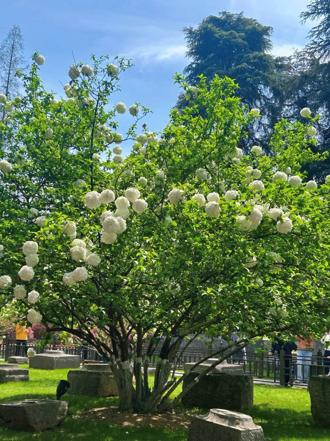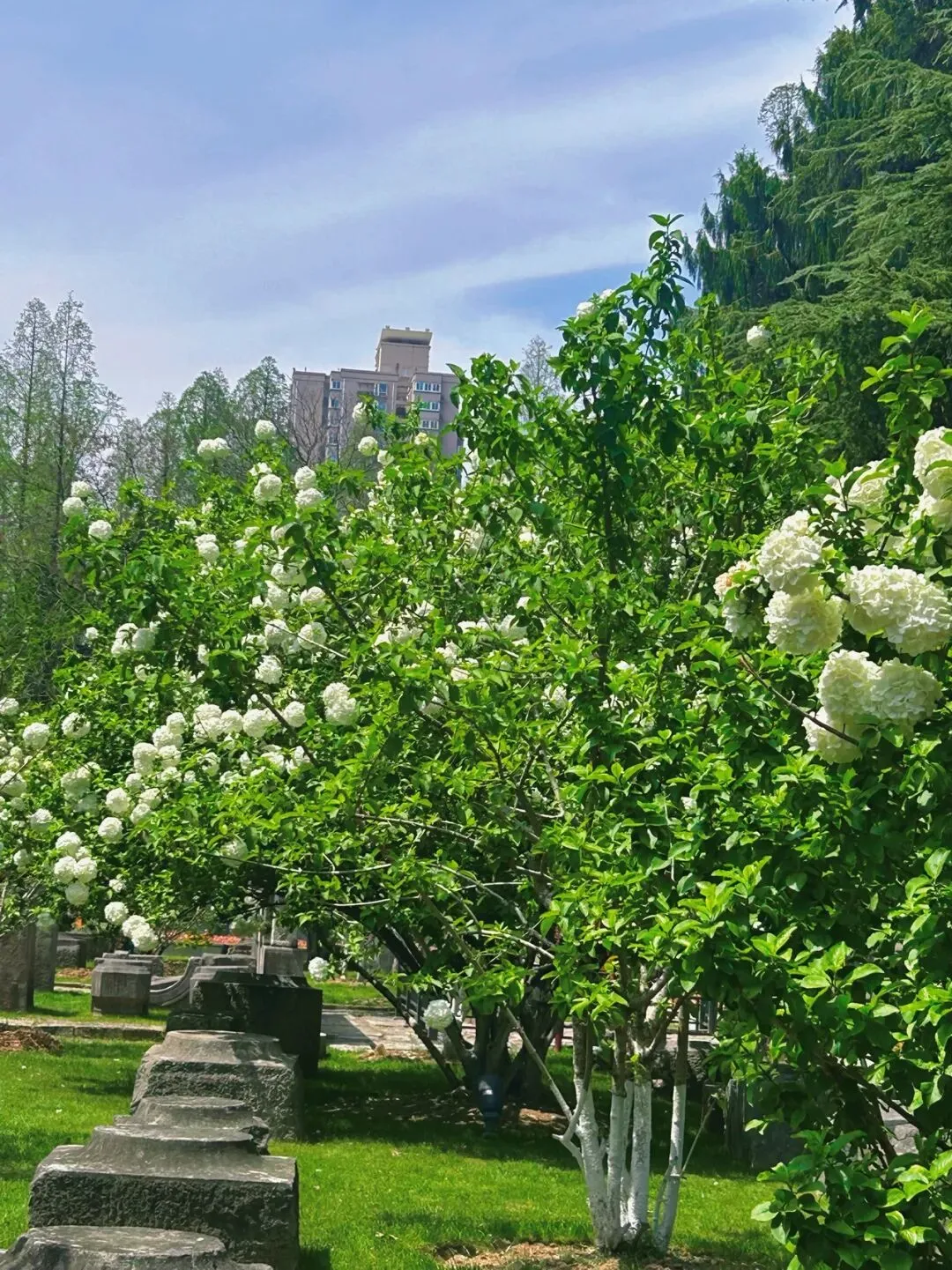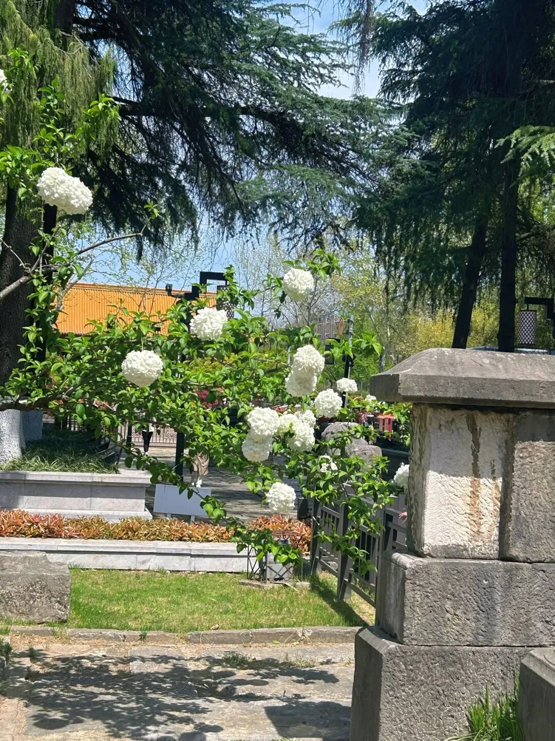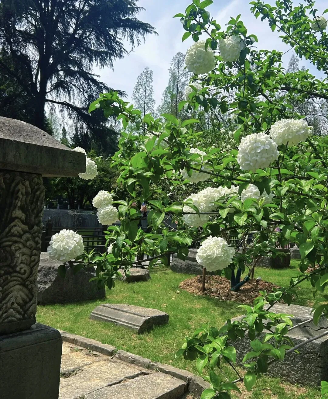 午朝门的绣球种在明故宫遗址的石刻周围,白色的花球配着斑驳的石板路、古老的柱础,那种历史感和生命力的碰撞,真的很有味道。