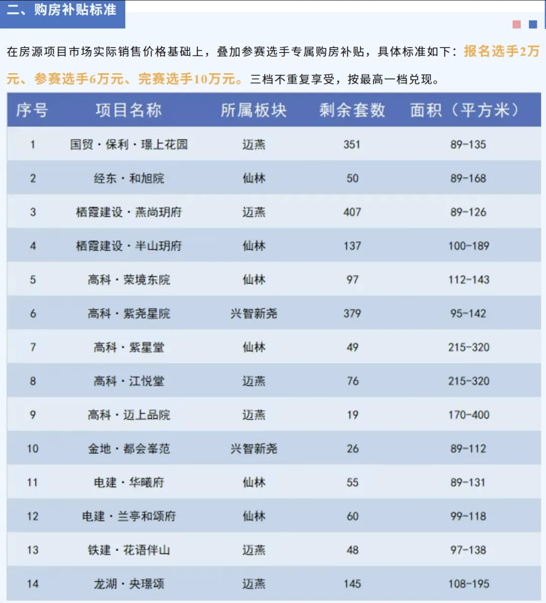 我们算一笔账,栖霞区参与活动的14个楼盘,户型从89平到400平。