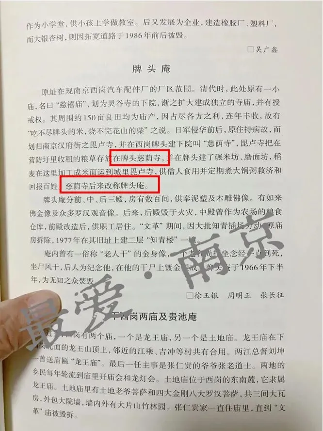 清代时,此处原有一小庙,名曰“慈禧庙”,划为灵谷寺的下院,渐之扩大建成独立的寺庙,并有授戒权。其周围约150亩良田均为庙产,因占尽各方之利,连年丰收,故有“吃不尽牌头的米,烧不完花山的柴”之说。日军侵华前后,原住持病故,而划归南京汉府街之毘卢寺,并在西岗牌头建下院叫“慈荫寺”,毘卢寺把在营防圩里收租的粮草存放在牌头慈荫寺,并在牌头建了碾米坊、磨面坊,稻麦在这里加工成米面运到城里毘卢寺,供僧人食用并定期煮大锅粥救济和回报百姓。慈荫寺后来改称牌头庵。
