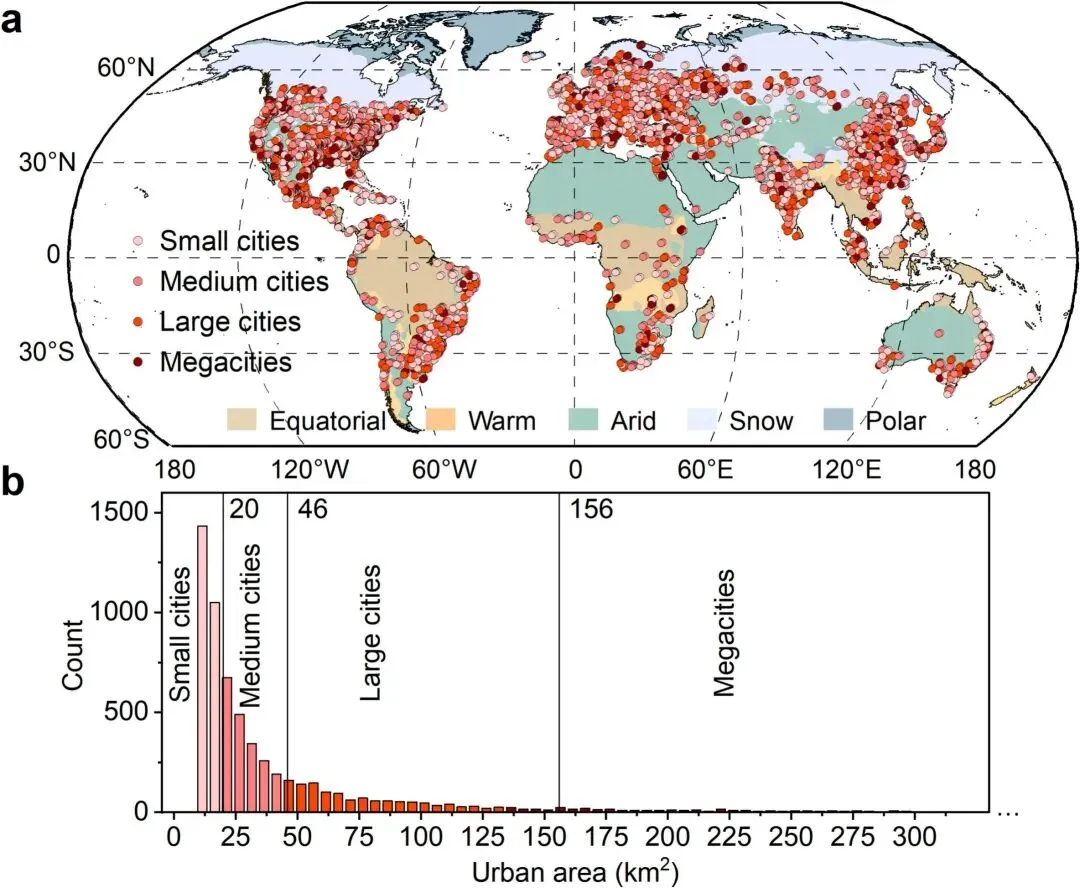 🖼️ 图 1. 全球选定城市的空间分布 ( a ) 和按城市规模划分的频率统计数据 ( b )。