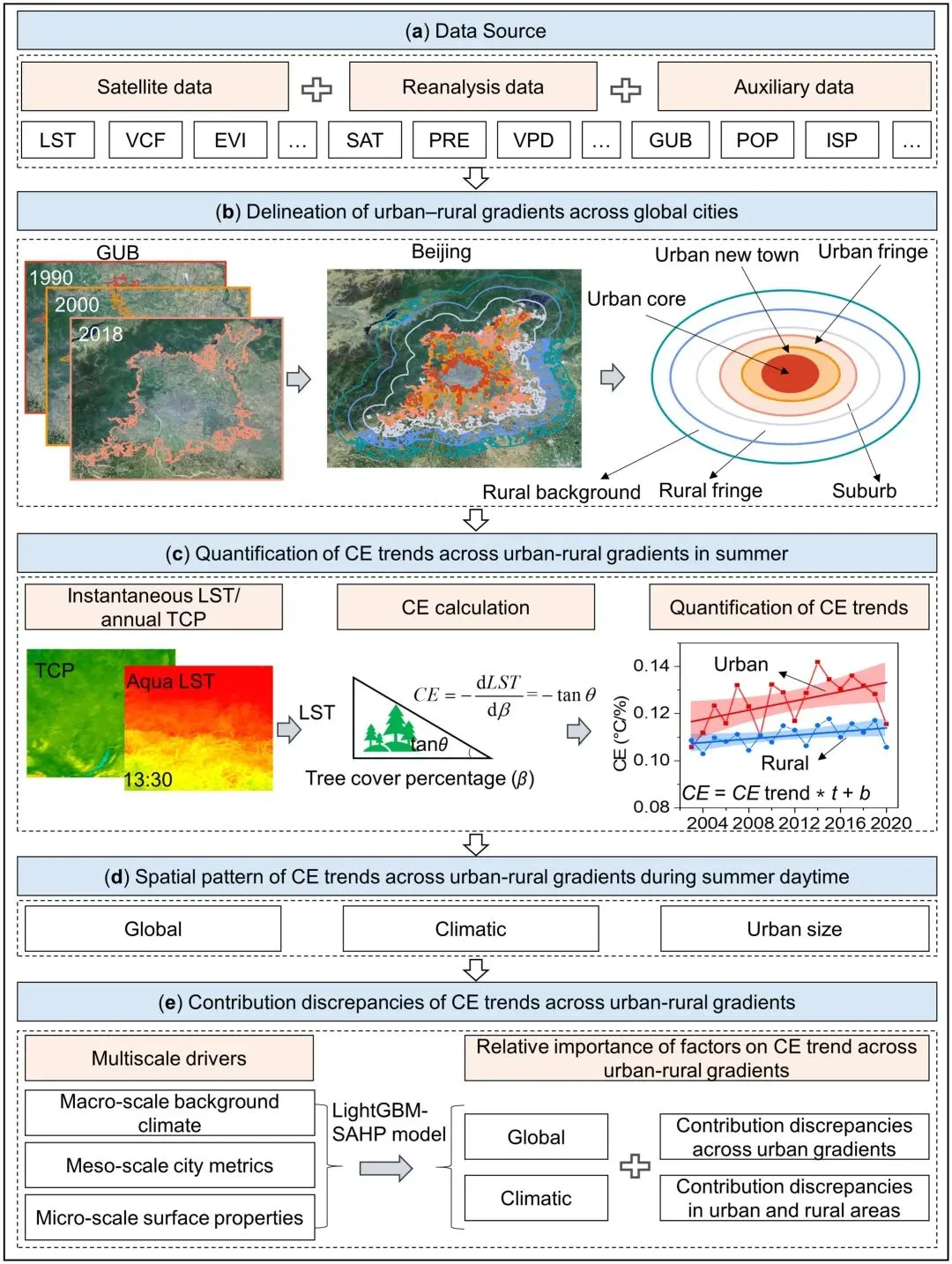 这项研究整体上分为三个主要步骤。首先,作者基于多时相全球城市边界数据构建统一的城乡梯度分区体系,把每个城市切分为六类空间单元。其次,利用 MODIS 地表温度与树木覆盖百分比数据,计算每个梯度中树木降温效率,并进一步拟合 2003–2020 年间的长期变化趋势。最后,在趋势结果基础上,引入气候、城市扩张和局地地表属性等多尺度变量,分析不同梯度下树木降温效率趋势的驱动来源。