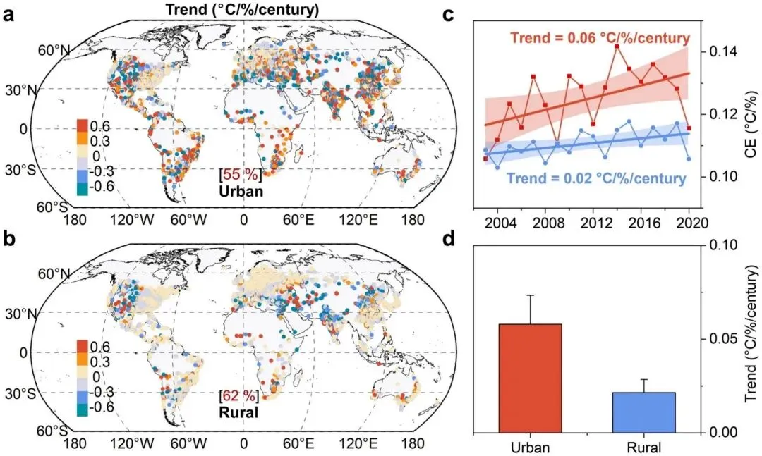 论文最核心的结果是:全球超过一半的城市树木降温效率呈上升趋势,而且这种趋势在城市和农村区域都存在,但城市区域更强。具体来看,城市区域平均 CE 趋势为 0.06 ± 0.02 °C/%/century,约为农村区域 0.02 ± 0.01 °C/%/century 的三倍。也就是说,在全球范围内,树木对白天地表降温的作用总体上是在增强的,但这种增强主要发生在城市内部,而不是均匀地出现在所有空间中。