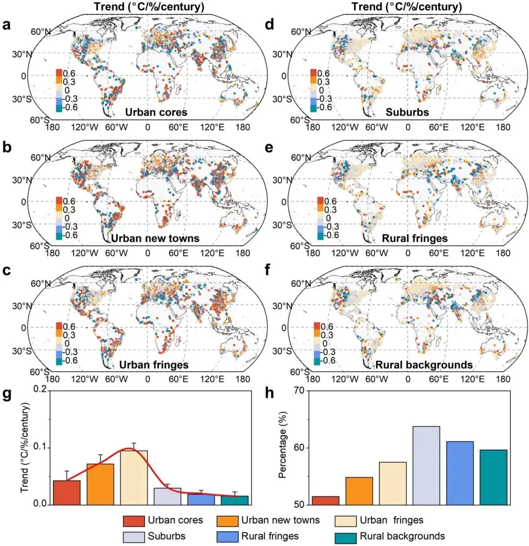 🖼️ 图 4. 全球不同城乡梯度下CE 趋势的空间格局 ( a – f ) 和平均 CE 趋势差异 ( g )。图 ( h)显示了在这些梯度下,CE 趋势呈上升趋势的城市百分比。