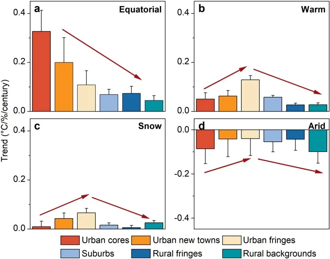 在不同气候区中,这种趋势又表现出明显差异。温暖区和雪气候区总体也呈倒 V 型,且各梯度 CE 趋势均为正值;赤道区则表现为从城市到乡村逐渐下降的近线性格局,平均值达到 0.13 ± 0.05 °C/%/century;最特殊的是干旱区,其各梯度 CE 趋势整体为负,平均为 −0.06 ± 0.06 °C/%/century。这一结果非常关键,因为它表明:并不是所有地区的树木降温能力都在增强,水分受限环境下反而可能持续减弱。