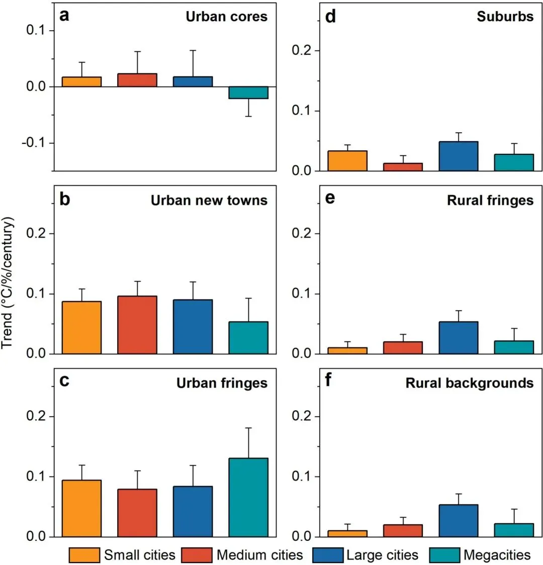 进一步沿城乡梯度比较后,作者发现 CE 趋势呈现非常清晰的倒 V 型结构。城市核心区平均为 0.04 ± 0.02 °C/%/century,新城区升至 0.07 ± 0.02 °C/%/century,城市边缘区达到最高值 0.10 ± 0.01 °C/%/century;而从郊区到乡村边缘区和乡村背景区,又分别回落到 0.03 ± 0.01、0.02 ± 0.01 和 0.02 ± 0.01 °C/%/century。这说明,树木降温效率增强最明显的地方不是传统市中心,而是快速扩张的城市边缘。 论文由此把“城市边缘区”识别为全球树木降温效率变化最敏感的空间带。
