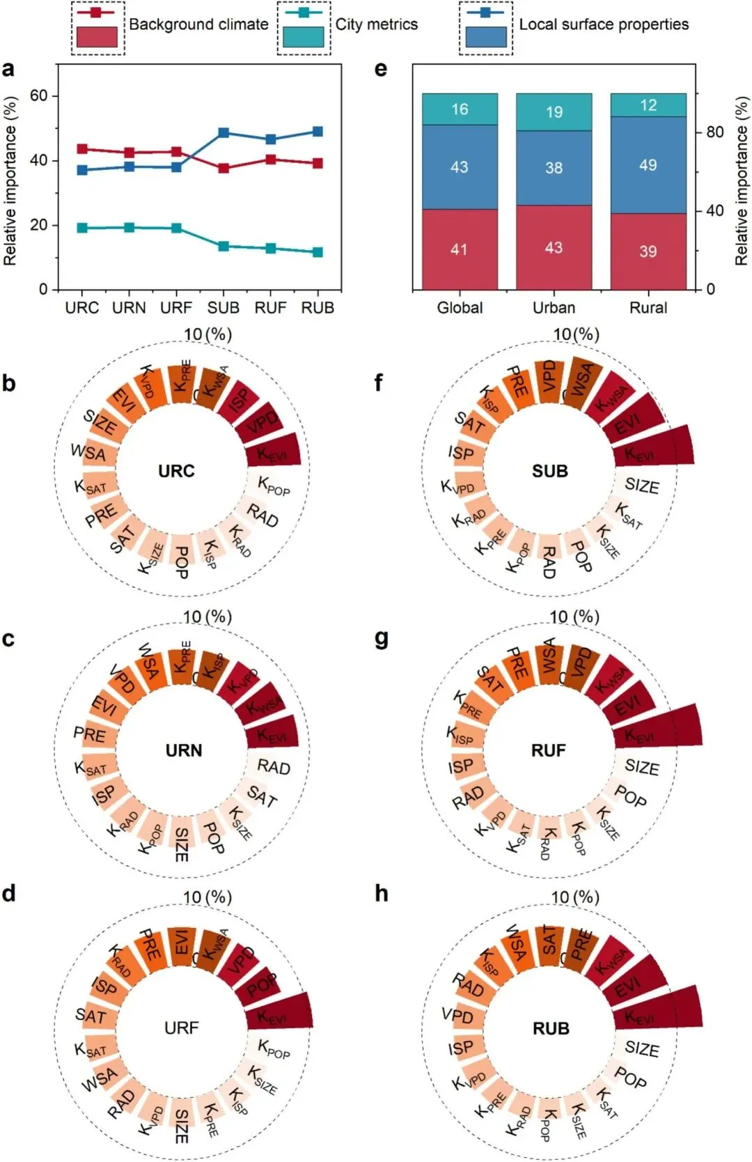 此外,论文还指出,树木降温效率趋势背后并不是单一机制在起作用。大尺度上有温度、降水、辐射和蒸汽压亏缺等背景气候因子;城市尺度上有城市面积和人口增长等扩张指标;局地尺度上还有植被状况、地表反照率和不透水面比例等地表特征。真正困难的地方不在于“列出这些因子”,而在于解释:为什么在城市区是某些因子更重要,而到了农村区又是另一类因子更重要。 这也是本文试图回答的关键科学问题之一。