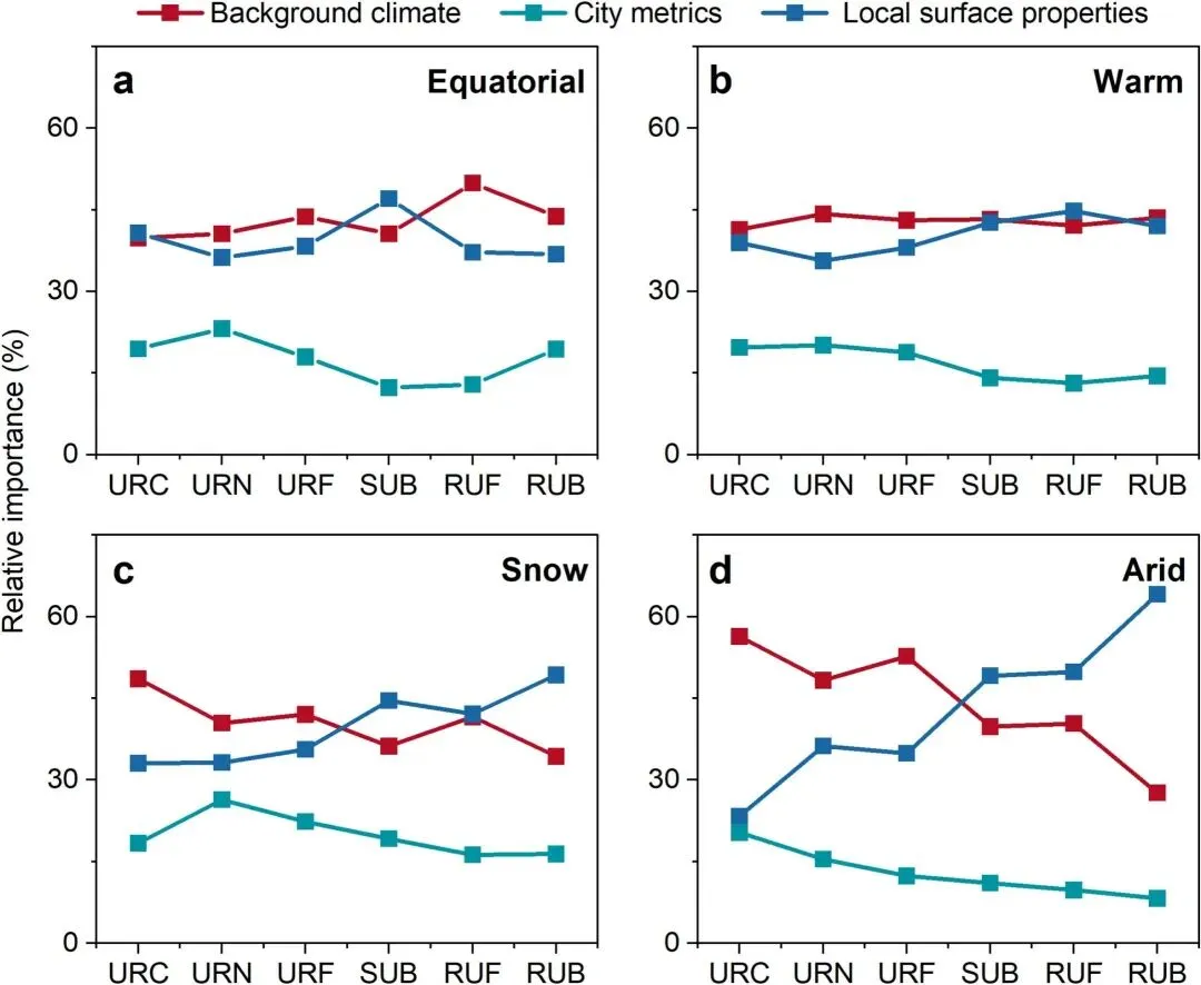 🖼️ 图 8. 夏季白天不同气候条件下城乡梯度中 CE 趋势的宏观背景气候、中观城市指标和微观局部表面特性的相对重要性。