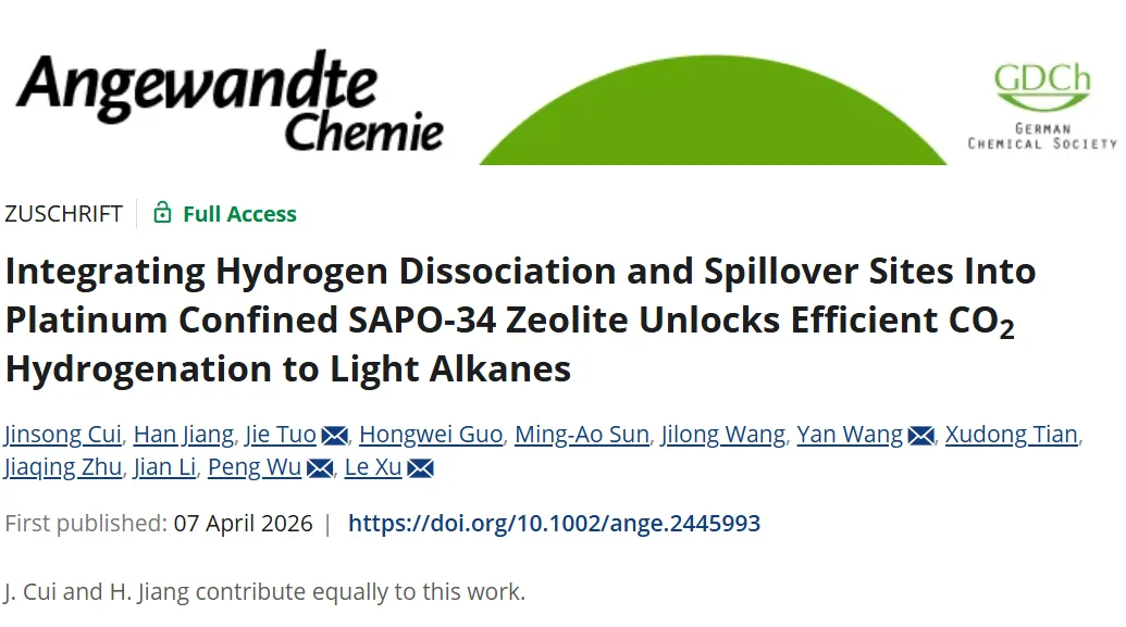 Jinsong Cui,Han Jiang, Jie Tuo*, Hongwei Guo, Ming-Ao Sun, Jilong Wang, Yan Wang*, Xudong Tian, Jiaqing Zhu, Jian Li, Peng Wu*, Le Xu*. Integrating Hydrogen Dissociation and Spillover Sites Into Platinum Confined SAPO-34 Zeolite Unlocks Efficient CO2 Hydrogenation to Light Alkanes. Angew. Chem. Int. Ed. 2026, e2445993.