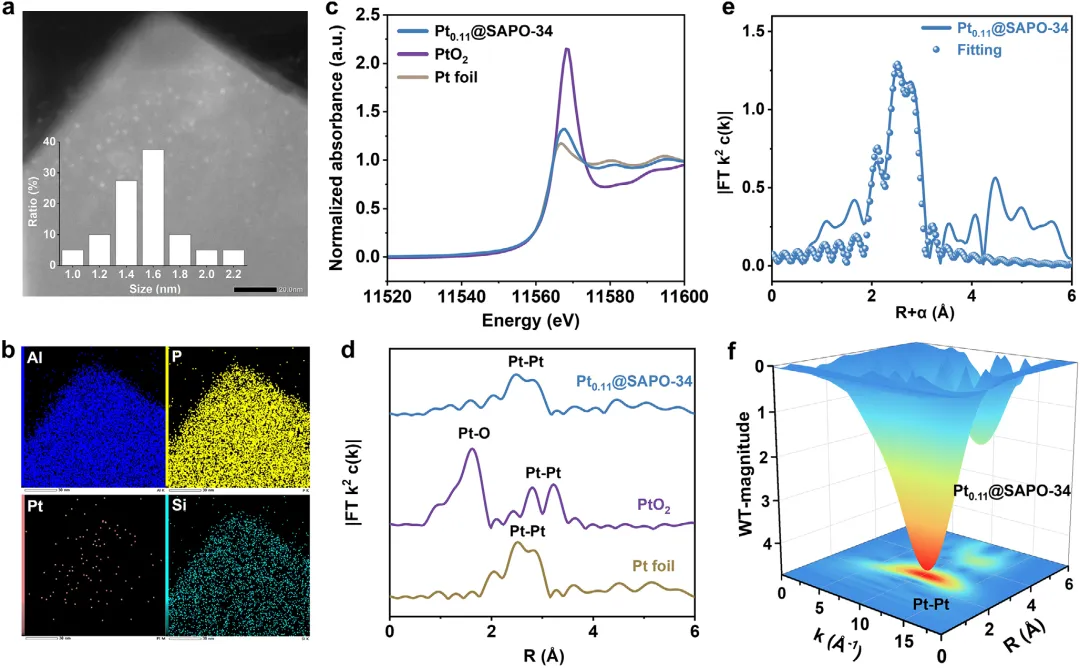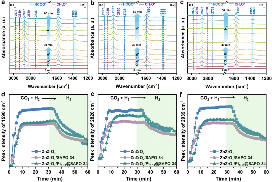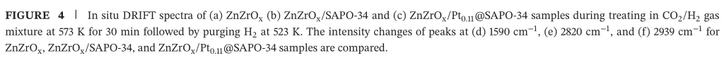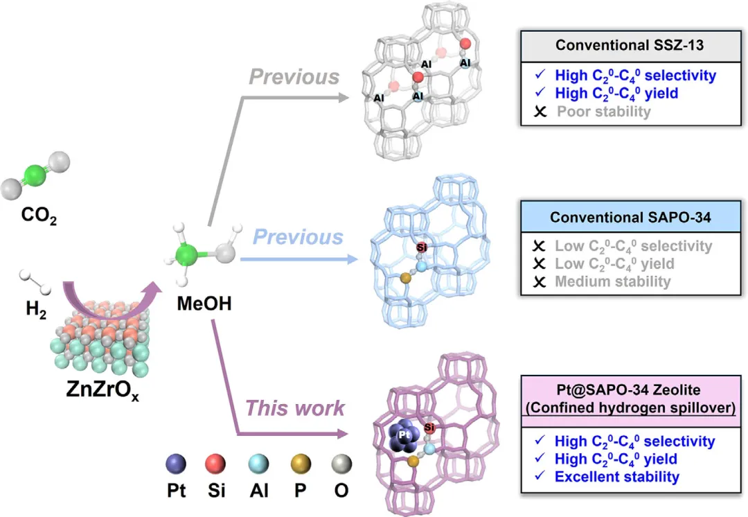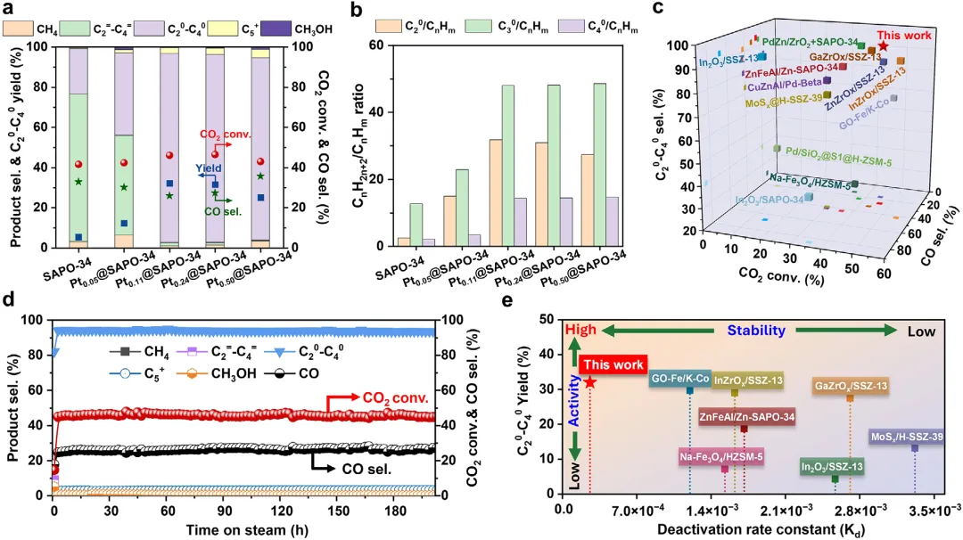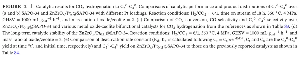 要点1. 本文设计了一种基于痕量Pt物种(0.11 wt.%)限域于SAPO-34中并与ZnZrOx固溶体耦合的新型OXZEO双功能催化体系(ZnZrOx/Pt@SAPO-34),实现了46.1%的CO₂转化率与94.1%的C20-C40选择性,且具有超过200小时的优异稳定寿命。