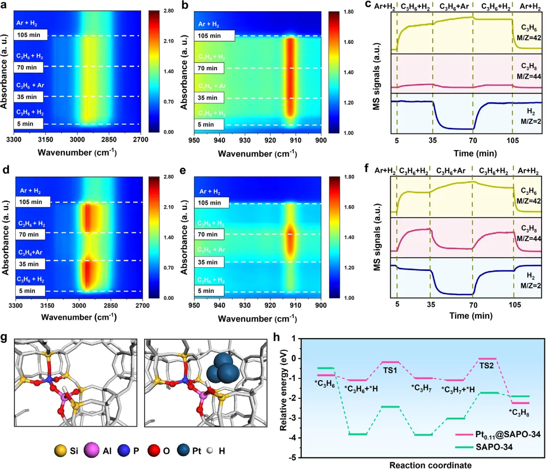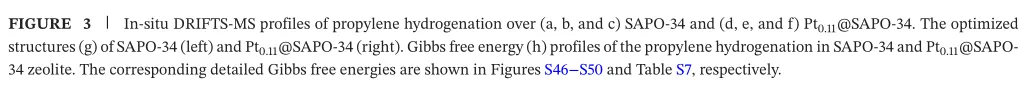 要点2. 其出色的催化性能归因于SAPO-34中Pt物种的限域氢溢流机制,该机制抑制了积炭,并实现高效的H₂解离与溢流,从而显著促进轻质烯烃加氢生成相应的烷烃。