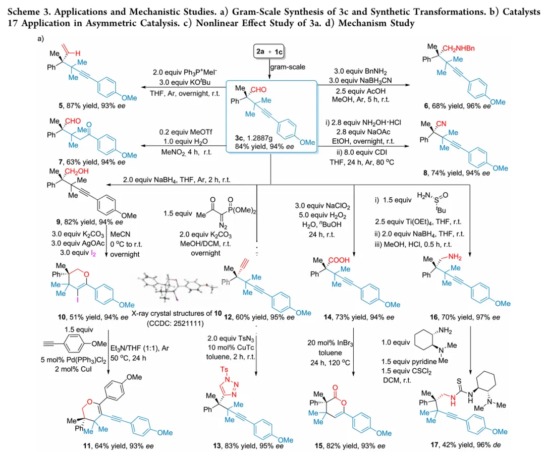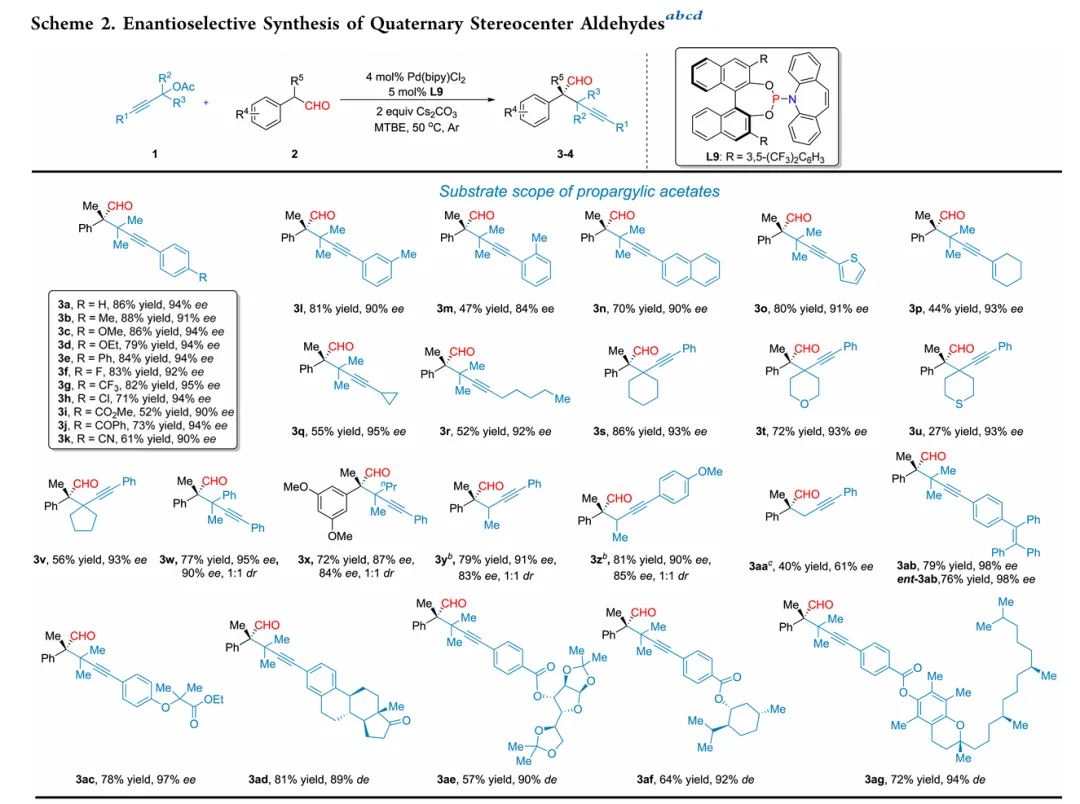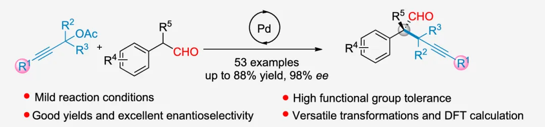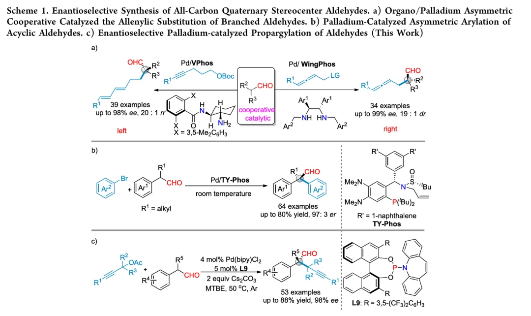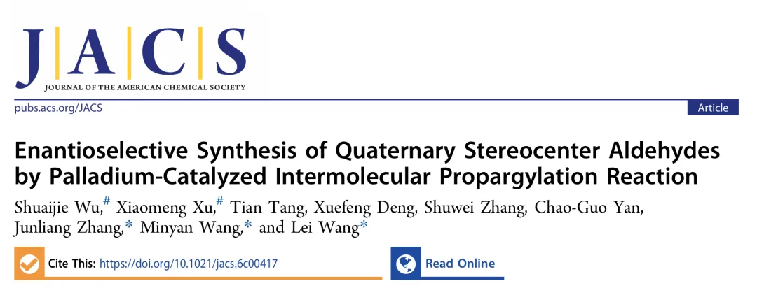 扬州大学王磊/张俊良(复旦大学)/南京大学王敏燕JACS:钯催化分子间炔丙基化反应对映选择性合成含季碳手性中心的醛类化合物