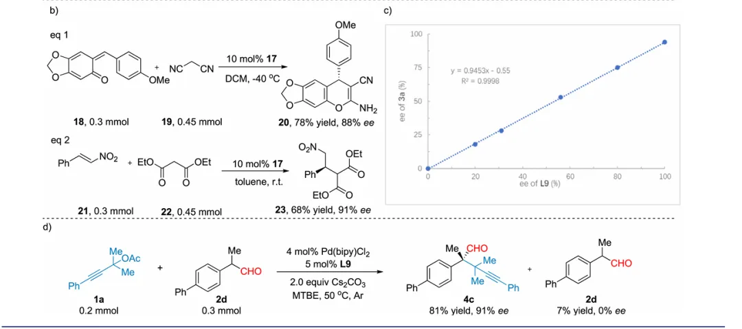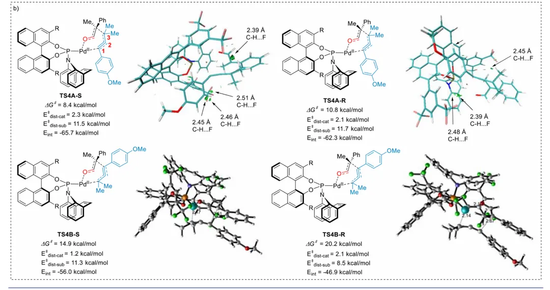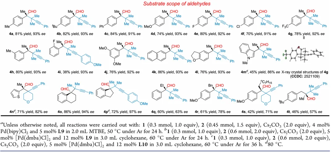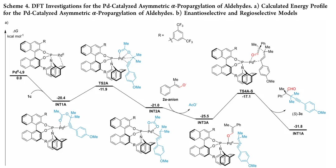 In conclusion, we have developed an efficient and enantioselective palladium-catalyzed α-propargylation of α-alkyl-α-aryl disubstituted aldehydes with propargylic acetates. This protocol provides straightforward access to enantioenriched aldehydes bearing all-carbon quaternary stereocenters in moderate to good yields with excellent enantioselectivities. Notably, a BINOL-derived phosphoramidite ligand plays a crucial role in achieving precise control over both chemoselectivity and enantioselectivity. The method features a broad substrate scope, mild reaction conditions, and operational simplicity, enabling gram-scale synthesis, as well as diverse downstream transformations to access structurally complex enantioenriched molecular frameworks. Density functional theory (DFT) calculations were conducted to elucidate the reaction mechanism, particularly the origin of enantiocontrol. Ongoing studies in our laboratory are focused on extending this strategy to other asymmetric palladium-catalyzed transformations.