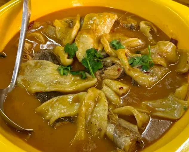 如果只推荐一道,我会选杂鱼锅贴。做法不复杂,小河杂鱼先煎到微焦,再加姜、蒜、酱油和热水慢炖,锅边贴一圈玉米面或杂粮面饼。鱼把汤熬浓了,锅贴把香气吸足,边缘脆,里头软,咬一口,带着一点锅巴气,很家常,也很顶饿。
