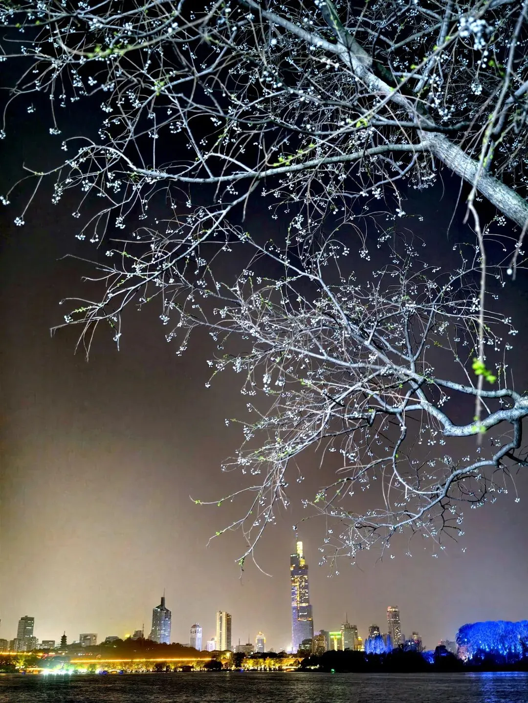 夜晚的玄武湖春风沉醉,游人如织,湖畔开着一树一树的桃花或是樱花,夜色中看不清花本来的色彩,但在灯光照射下,反而呈现出一种诡丽的美。