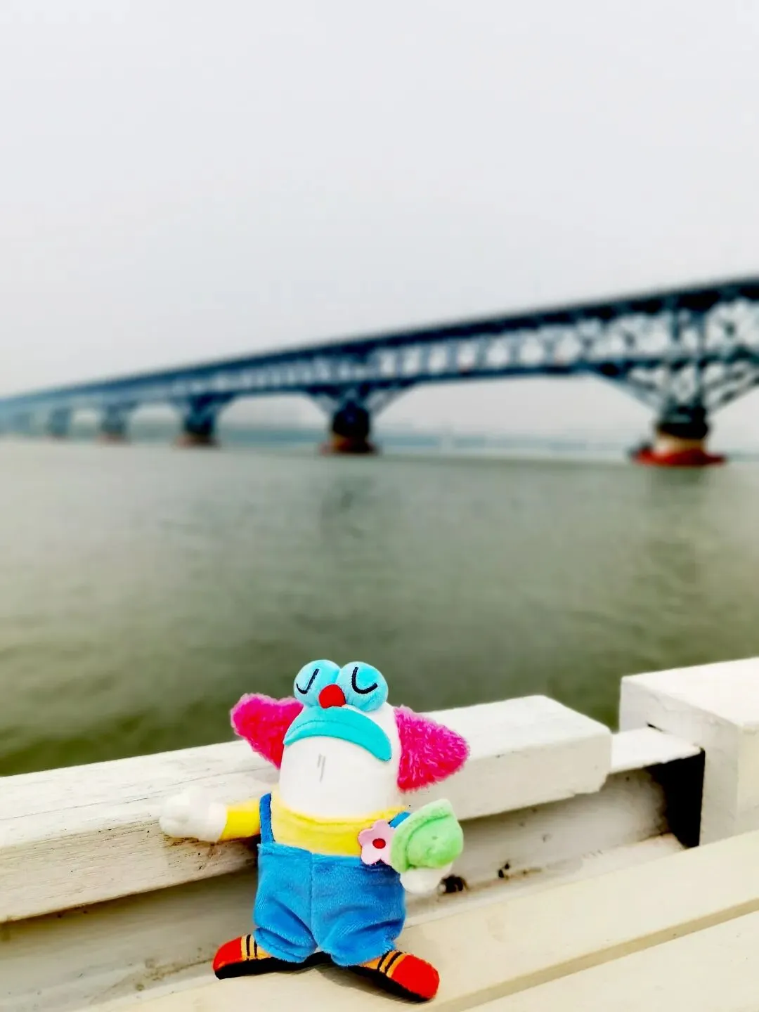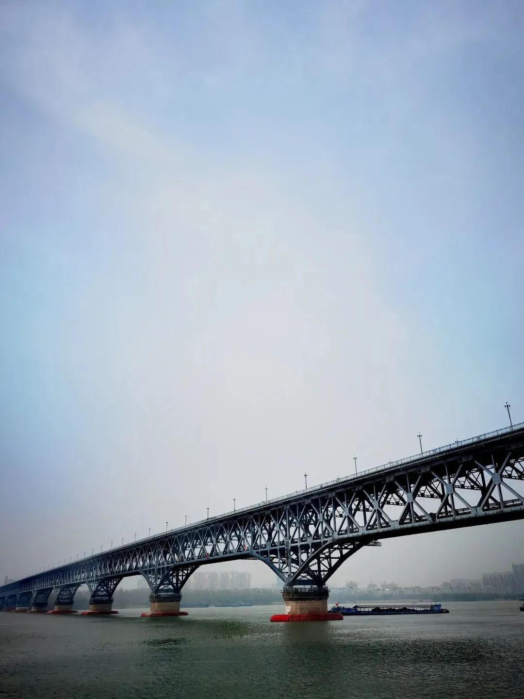 站在甲板上,能感觉到船身随着水流轻微晃动。虽是晴天,但空气略显浑浊,极目远眺,远处的江岸有些苍茫。背对着长江大桥,春阳暖暖地照着,偶尔有火车从桥上疾驰而过。