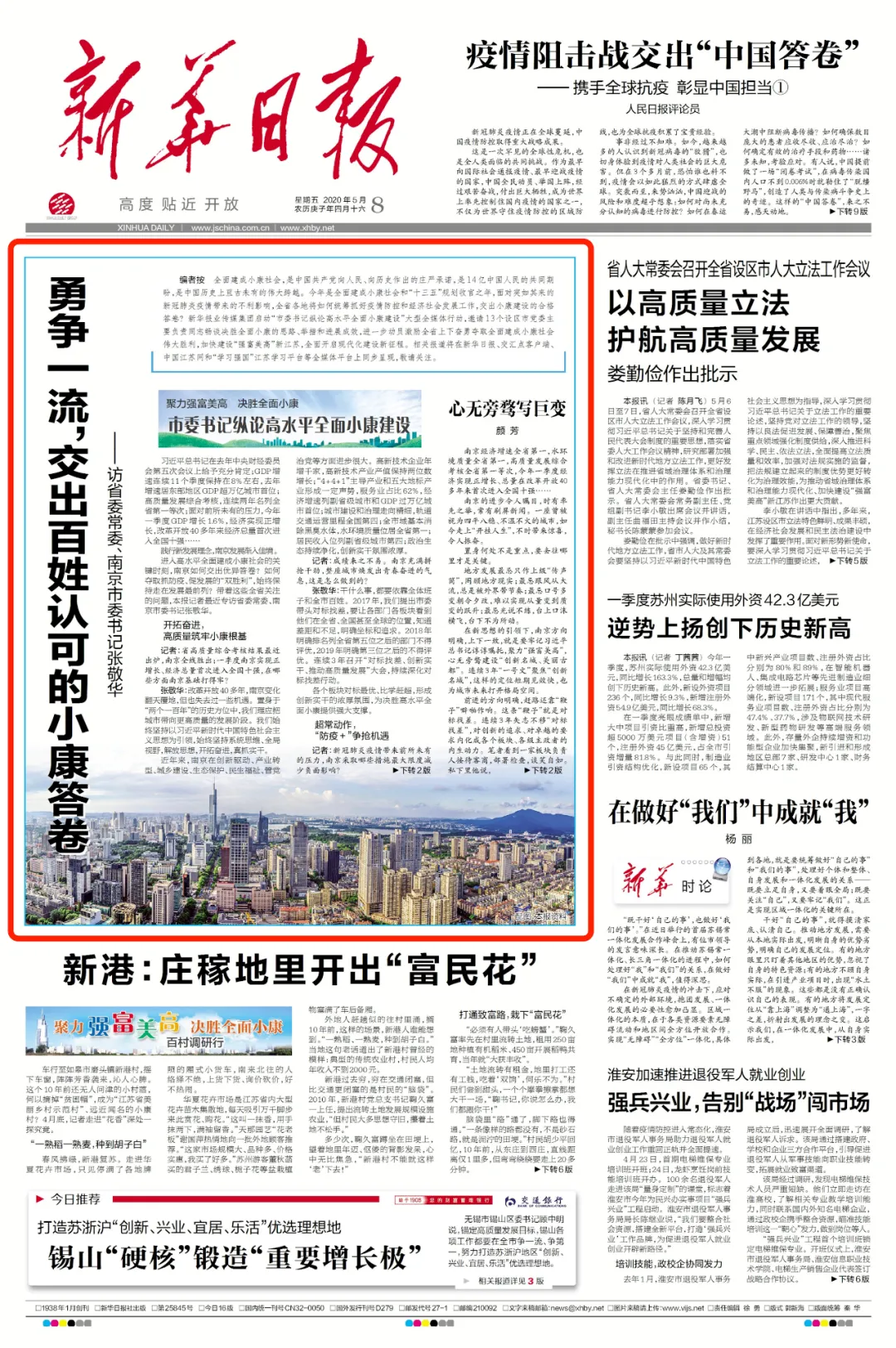 《新华日报》还配发了《心无旁骛写巨变》的短评文章。文章称赞,南京的进步令人瞩目,时有率先之举,常有刷屏新闻。一座曾被视为四平八稳、不温不火的城市,如今走上“开挂人生”,不时带来惊喜,令人振奋。