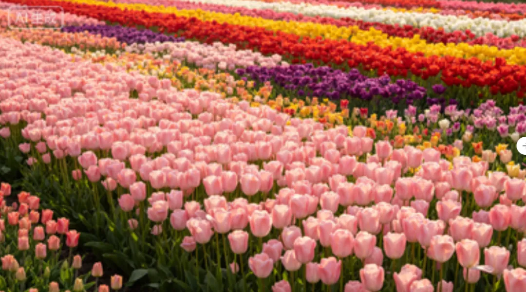 红的、黄的、紫的、白的、粉的……各色郁金香整齐排列,像大地上铺开的花毯。微风吹过,花朵轻轻摇曳,安静而美好。
