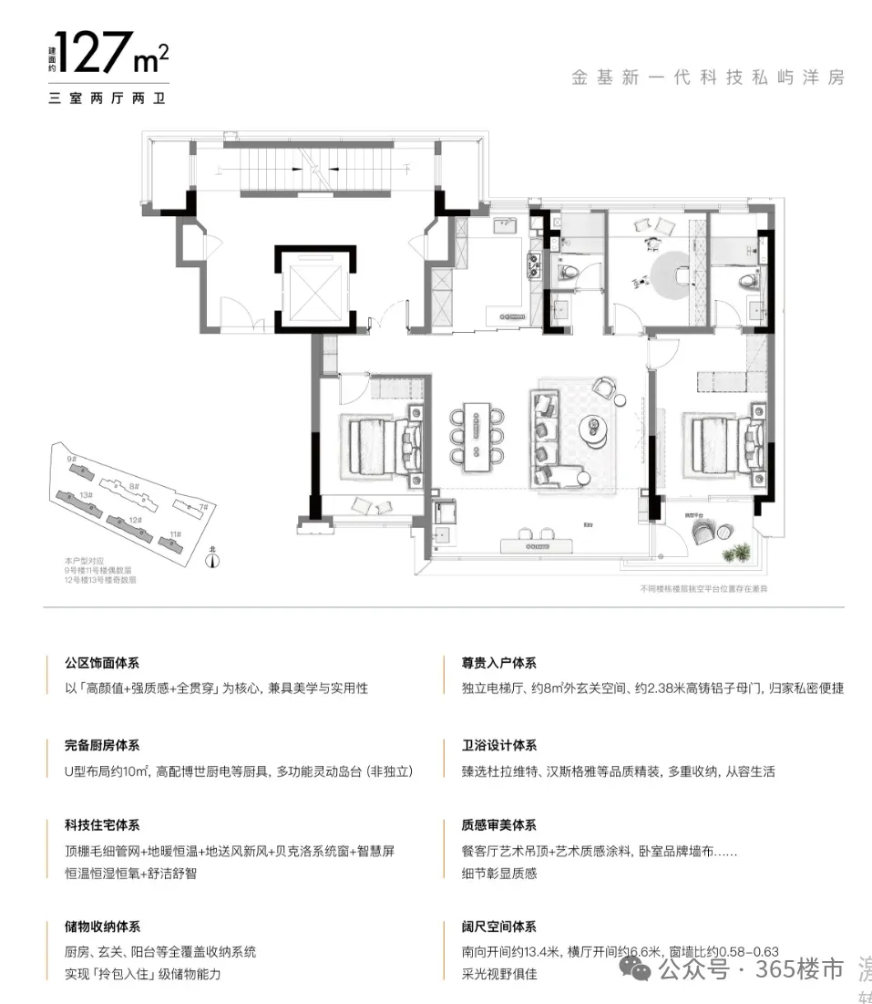 3、建面约127-168㎡,超大窗墙比,配备科技系统屿樾府2期一共打造了6栋5-8层住宅,户型面积段有127、149、168㎡。项目首开推出房源建面约127㎡的三房两厅两卫户型,南向开间约13.4米,南侧窗墙比高达0.53-0.63,这个在市面项目中非常罕见。进入到项目建面约127㎡样板间,我的第一感觉便是,这并不像是一个120多平户型能够呈现出的空间感。项目打造了一个面宽约6.6米、整体近44㎡的方厅,外加通铺大尺寸地砖,全景落地窗所带来的采光面,给人一种面积超160㎡大平层的既视感。在厨房电器方面,使用的是博世或同档次品牌四件套,铂浪高或同档次品牌大单槽与抽拉龙头。而且,在收纳体系方面,金基也毫不令色,博洛尼或同档次品牌厨房橱柜(约40个储物空间)也交付。除了厨房,玄关、阳台等区域都打造了收纳系统,未来业主可以拎包入住,省去装修麻烦。屿樾府的空间使用率不仅体现在餐客厅的尺寸上,在样板间现场,我发现其各个空间都非常充裕,主卧、客卧、厨房、书房皆是如此。项目样板间之上配备了一个大露台,冬日午后沐浴阳光、家人们欢乐下午茶时光......都将在这里上演,露台+阳台的设计给生活增加更多的想象空间。其实金基在一定程度上可以说是南京新房市场上科技系统的领路者,早在尚书里项目上就已经开始了科技系统的运用。