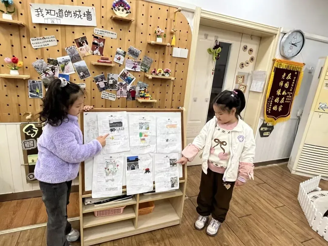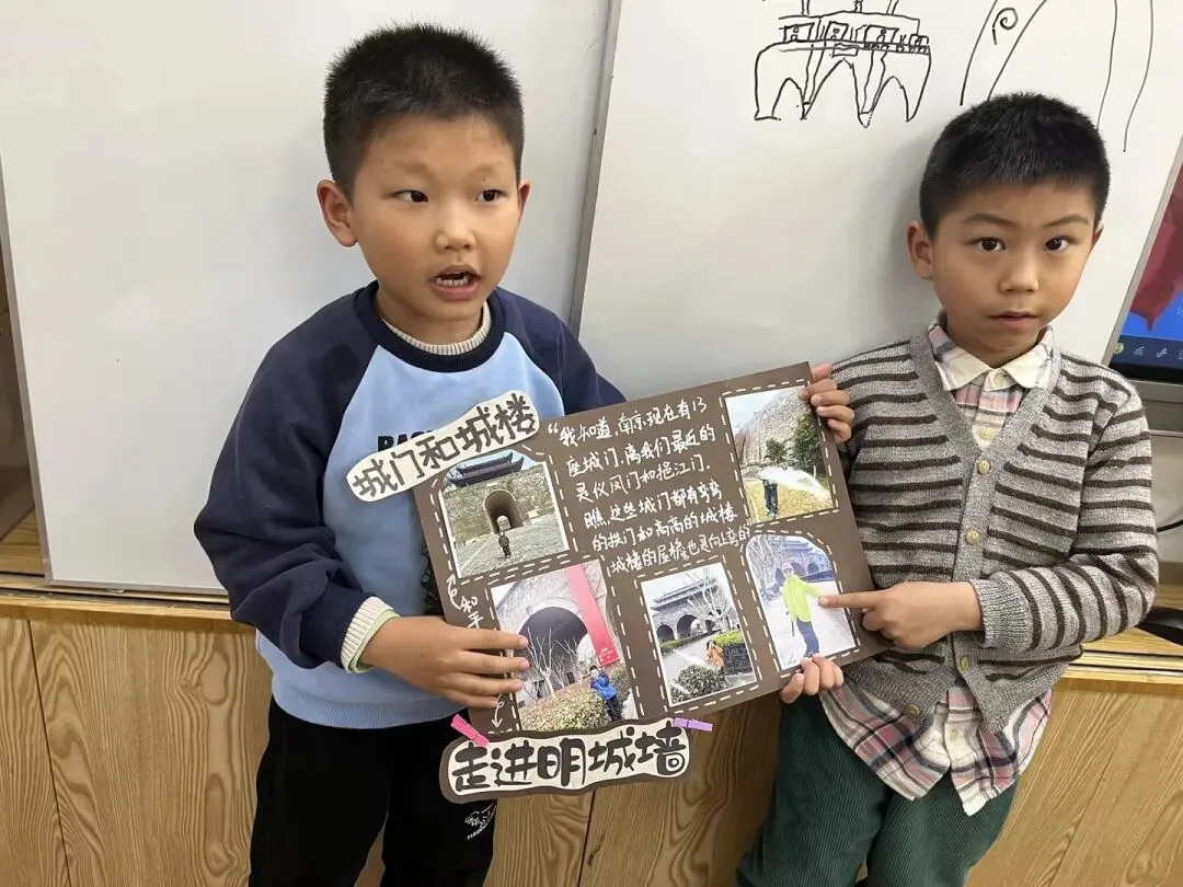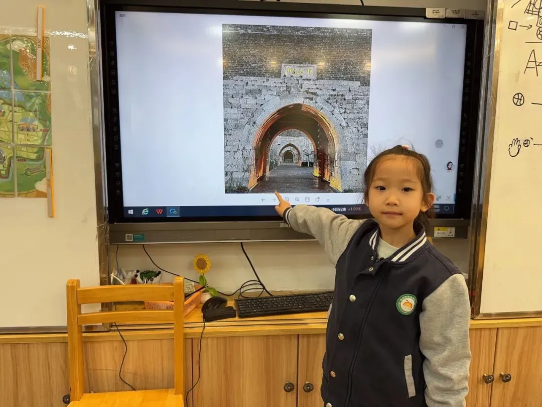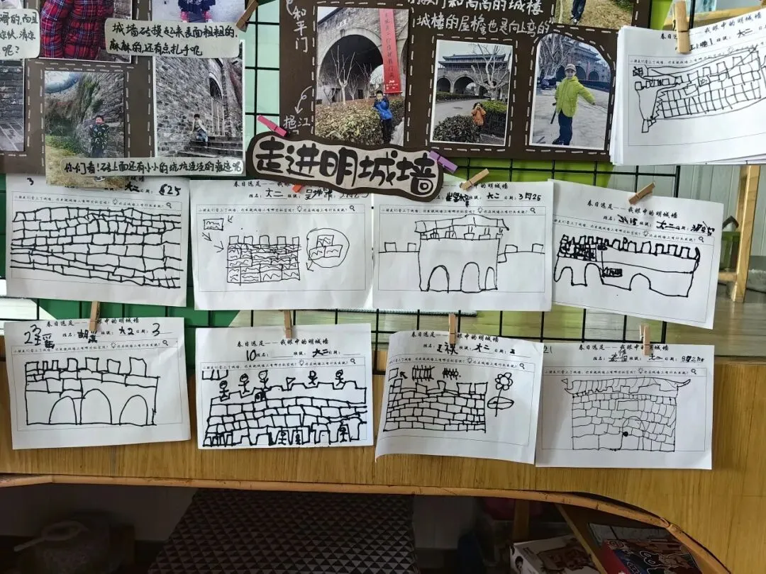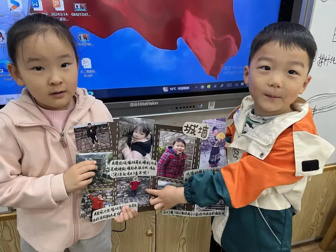 孩子们带来了自己和城墙的合照,在班级里踊跃分享。“我和爸爸妈妈去了仪凤门,它的大门上有好多圆圆的钉子,特别壮观!”忱忱举着照片开心地说。天天立刻接话:“我也去过,城门上面还有尖尖的屋顶呢!”