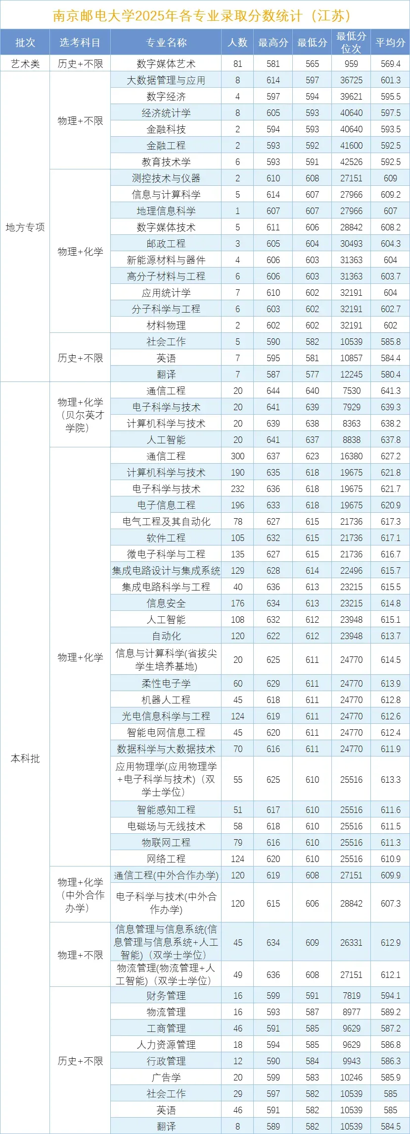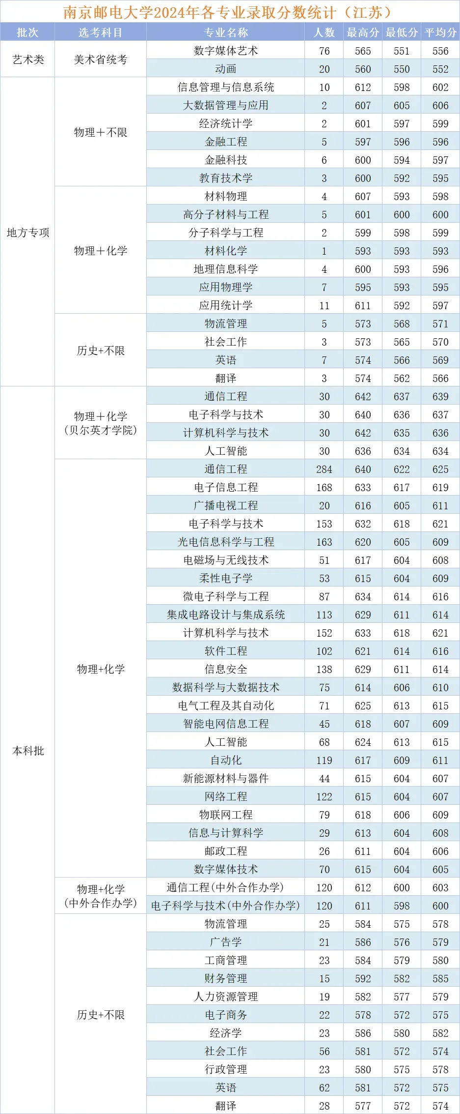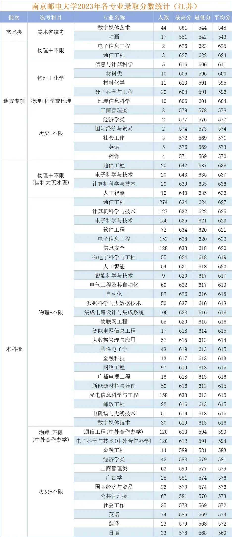 南京邮电大学近几年各专业录取分数——江苏