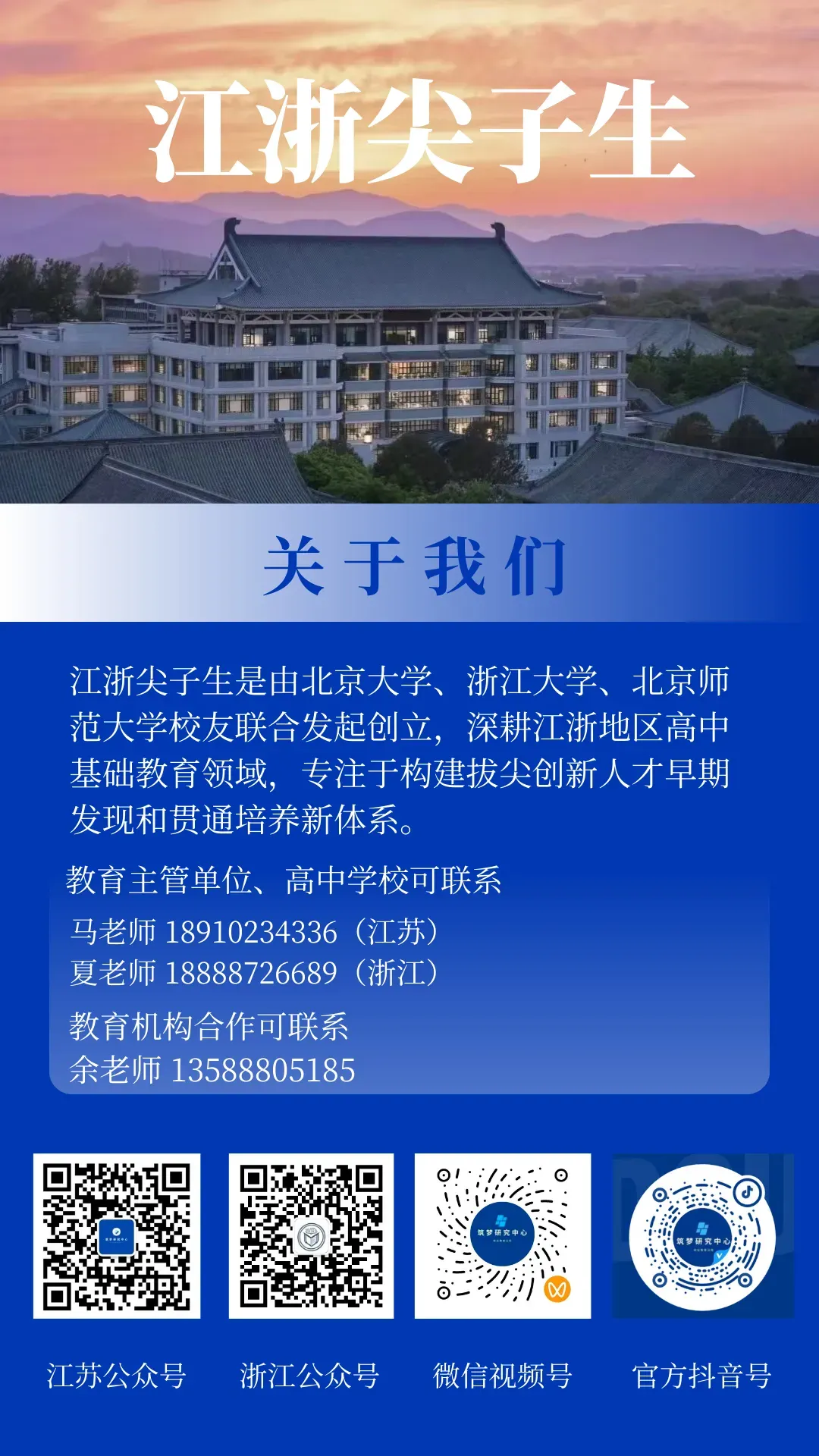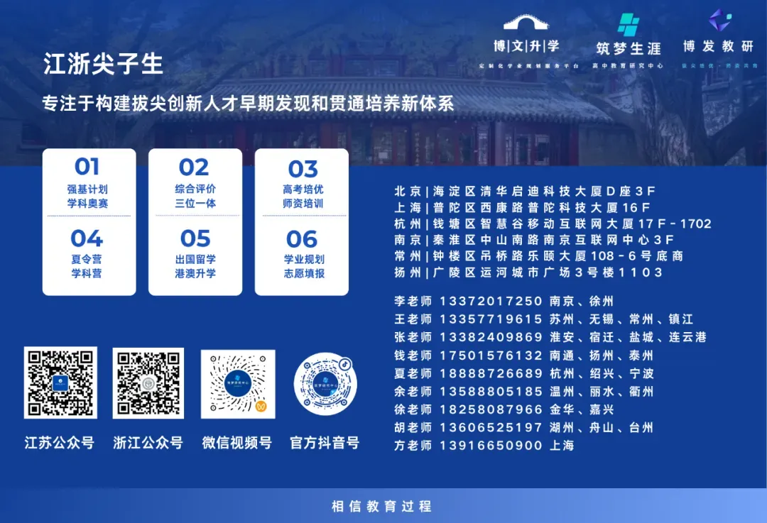 江浙尖子生提供强基计划、综合评价、高校专项、港澳升学、出国留学、高考志愿填报、考研保研、复试调剂等全过程规划指导服务,助力考生在学业生涯取得最终胜利。