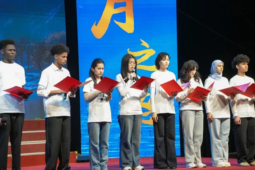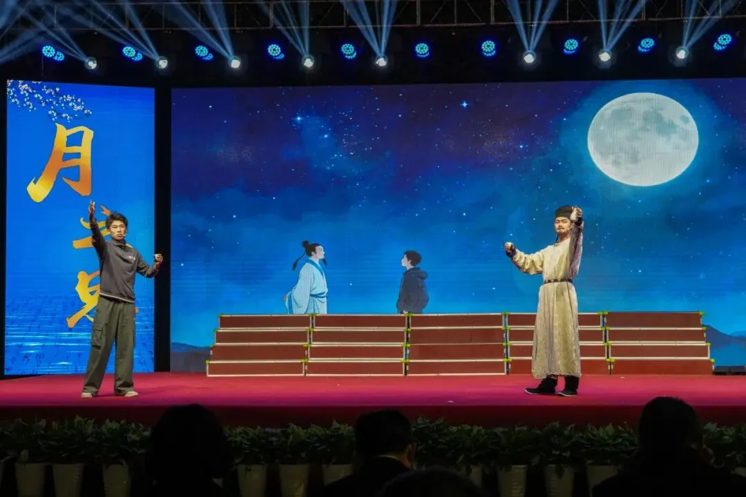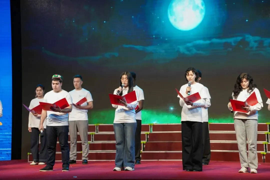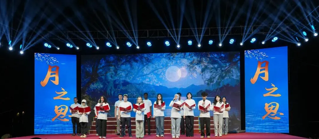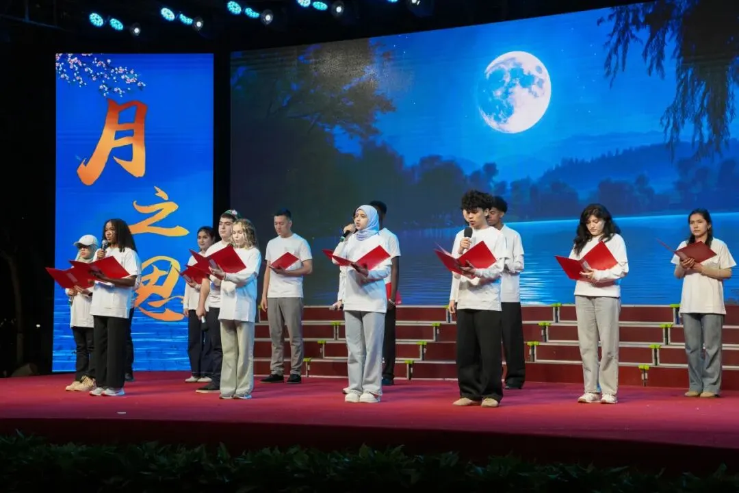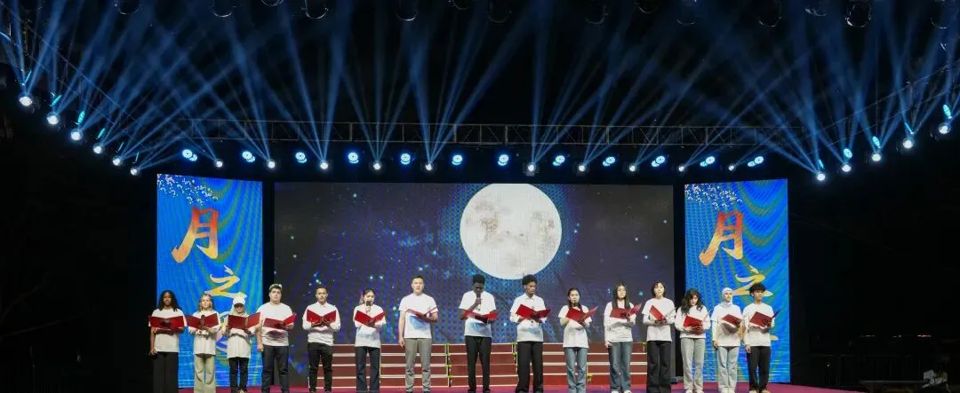 该篇章将现场氛围推向了高潮,在宁留学生代表集体朗诵《共一轮明月》,以异国视角解读月亮意象,彰显了“海上生明月,天涯共此时”的人类共通情感。