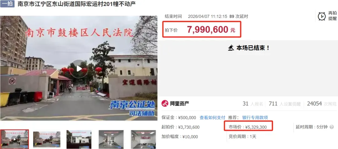 小区的独栋建筑,每户人家建筑风格都不同,中式、欧式、田园、现代风应有尽有,并且每家都有院子。从法拍平台公示的信息来看,这套别墅为简装状态,有长期居住痕迹。南向采光面较大,一楼带有宽敞的私家院落,二楼还设有露天观景平台。这类独栋产品长期无成交记录,在宏运国际村本就极为稀缺。正因如此,这套法拍独栋的出现,才引发了如此罕见的竞拍热度。目前,南京二手房市场上,该小区仅有1套264㎡的独栋在售,2层带阁楼,5室2厅,挂牌总价高达1298万,折合单价将近5万/㎡。相比之下,这套法拍房即便以799万成交,仍与市场挂牌价存在近500万的价差,被买家视为一次成功的“捡漏”。事实上,宏运国际村的这场法拍只是近期南京别墅市场升温的一个缩影。最近,南京楼市以景枫你山、金基汇锦国际、金基九月森林为代表的别墅产品,受到高端买家的强烈追捧。①方山联排,1628万成交,刷新江宁二手房天花板