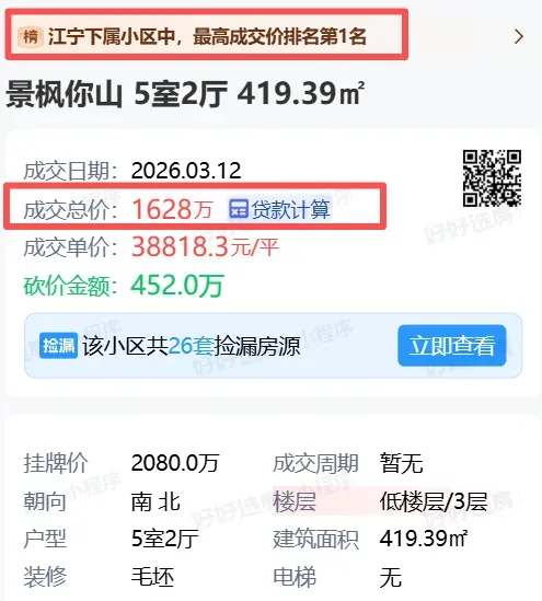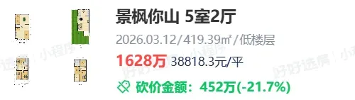 就在前几天,位于江宁方山脚下的老牌低密盘——景枫你山,成交了一套建面约419.39㎡的联排别墅,总价1628万,折合单价约3.88万/㎡。