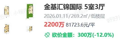值得注意的是,今年1月该小区刚成交过一套269.2㎡的联排,总价2200万、单价约8.17万/㎡,当时已经创下新高。短短一个多月,纪录再次被打破。