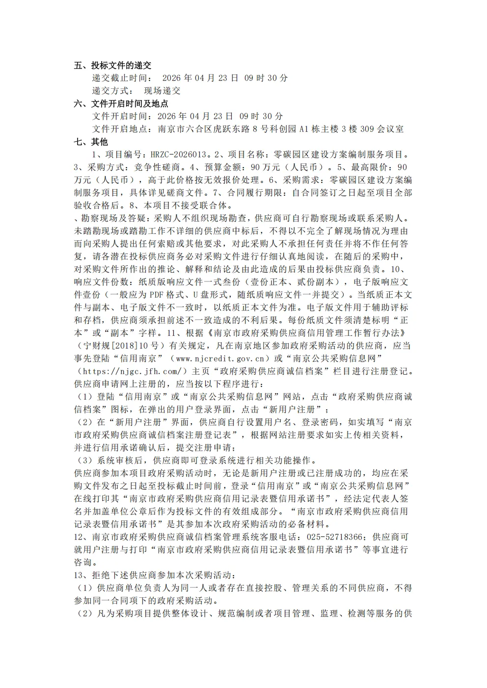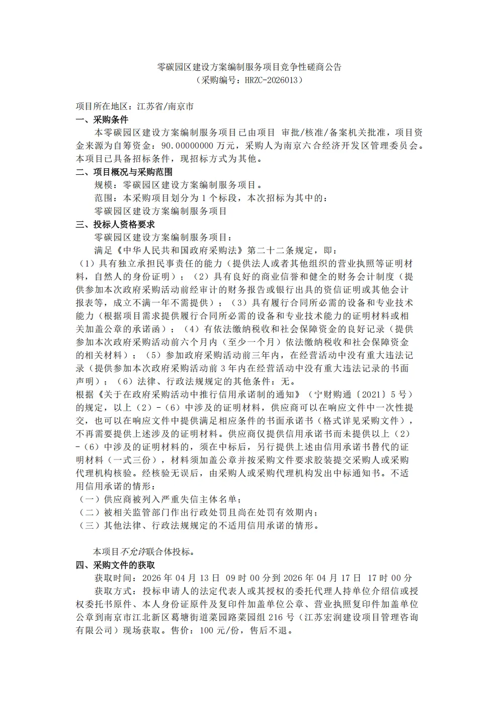 4月10日,江苏南京零碳园区建设方案编制服务项目竞争性磋商公告发布,