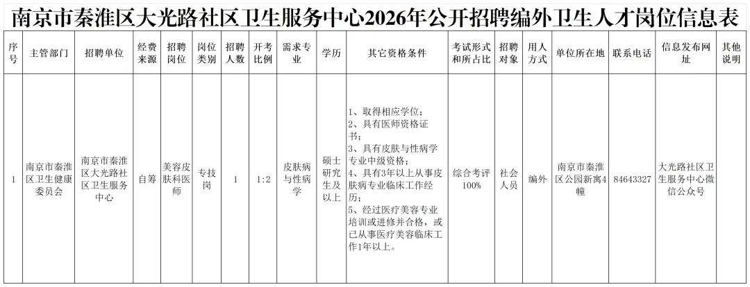 本次公开招聘工作,在上级主管部门指导下由南京市秦淮区大光路社区卫生服务中心组织实施,具体招聘岗位、数量、资格条件等详见《岗位信息表》(上图)。